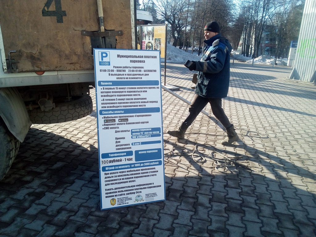 Оборудовать парковочное пространство на площади Ленина рабочие начали рано утром в субботу, 4 апреля. Они установили указатели и информационные щиты, а также ограничители парковочной зоны. Чуть ранее на площади появились знаки и паркомат.