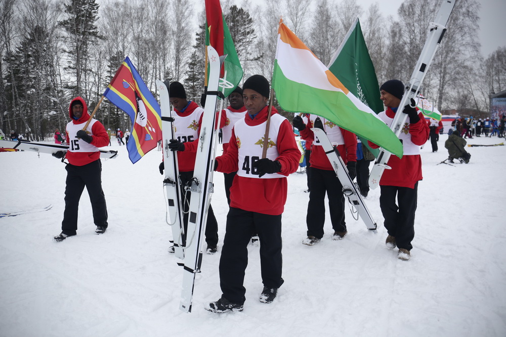 Для сибиряков «Лыжня России» — добрая традиция, а вот для курсантов военного училища из Конго — всё здесь сплошь экзотика. На занятиях они пусть и знакомились с техникой, но и массовый старт, и бескрайние снега непривычны рождённым в знойной Африке.