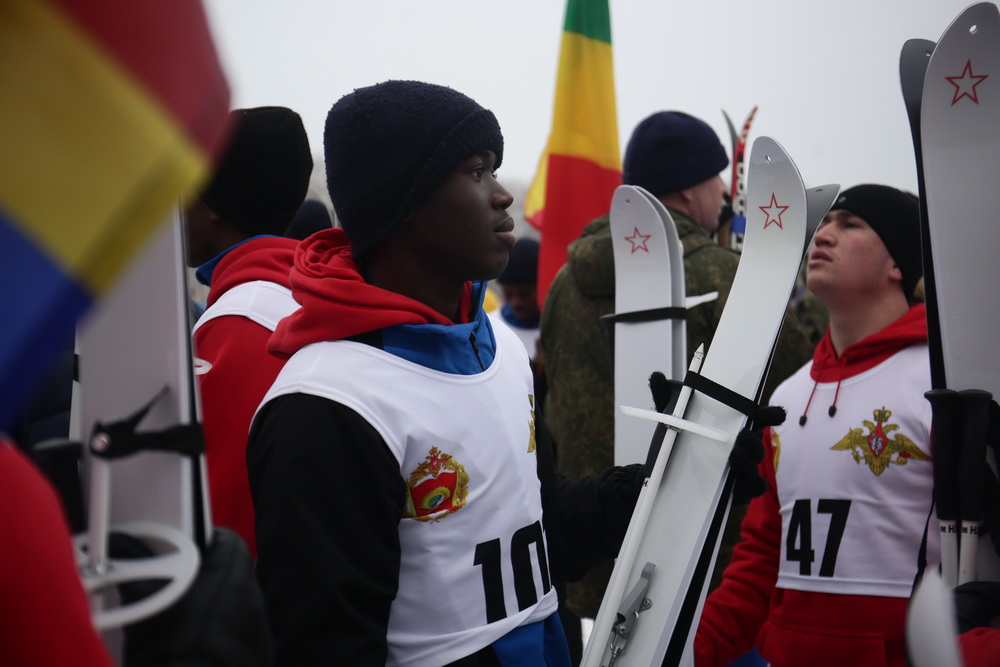«Только в России на лыжах кататься начал, потому что у нас зимы не бывает — как в России. Это новый вид спорта. Ну погода хорошая, тепло», — поделились курсанты Новосибирского высшего военного командного училища Патрик Обябя и Морис Макала.