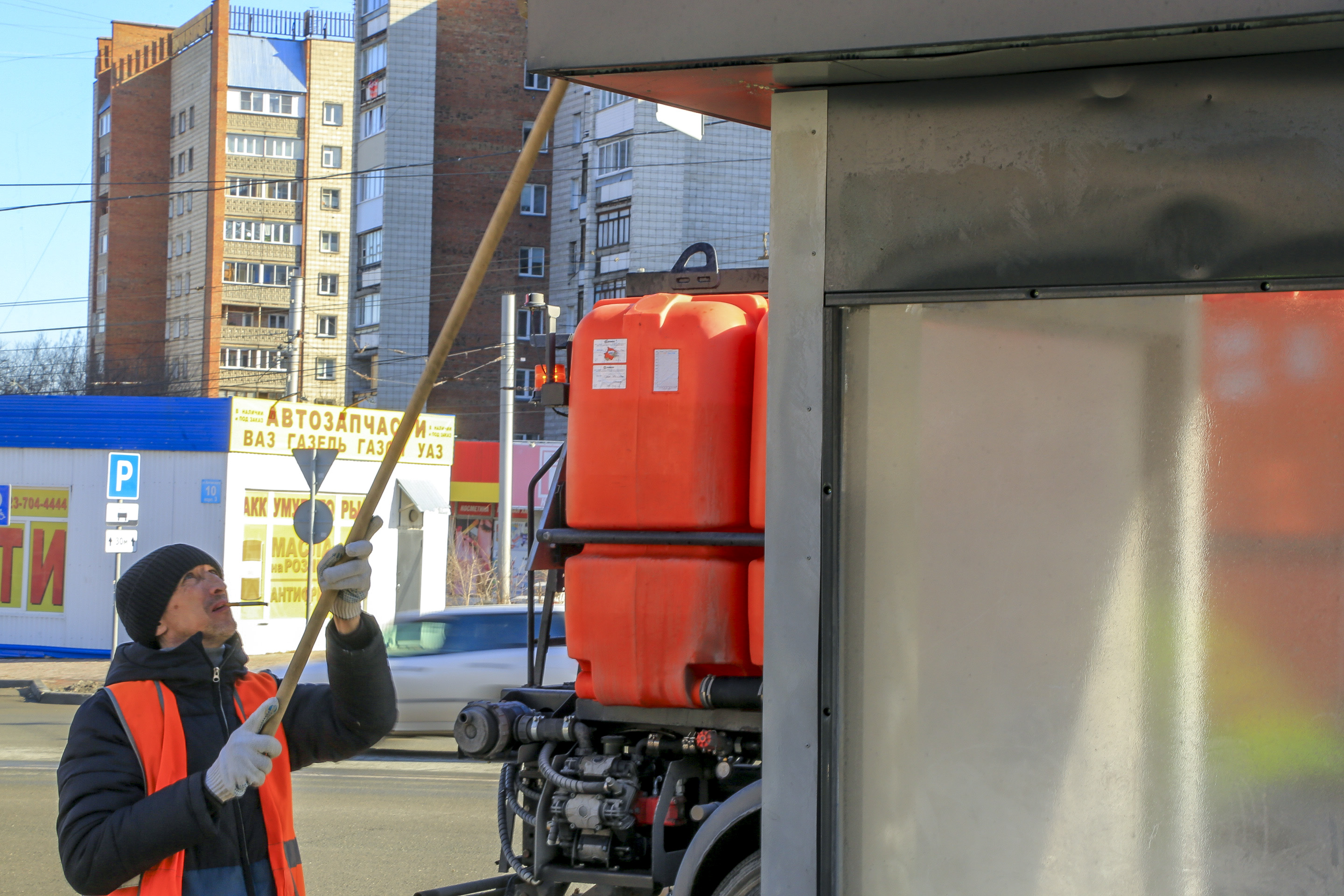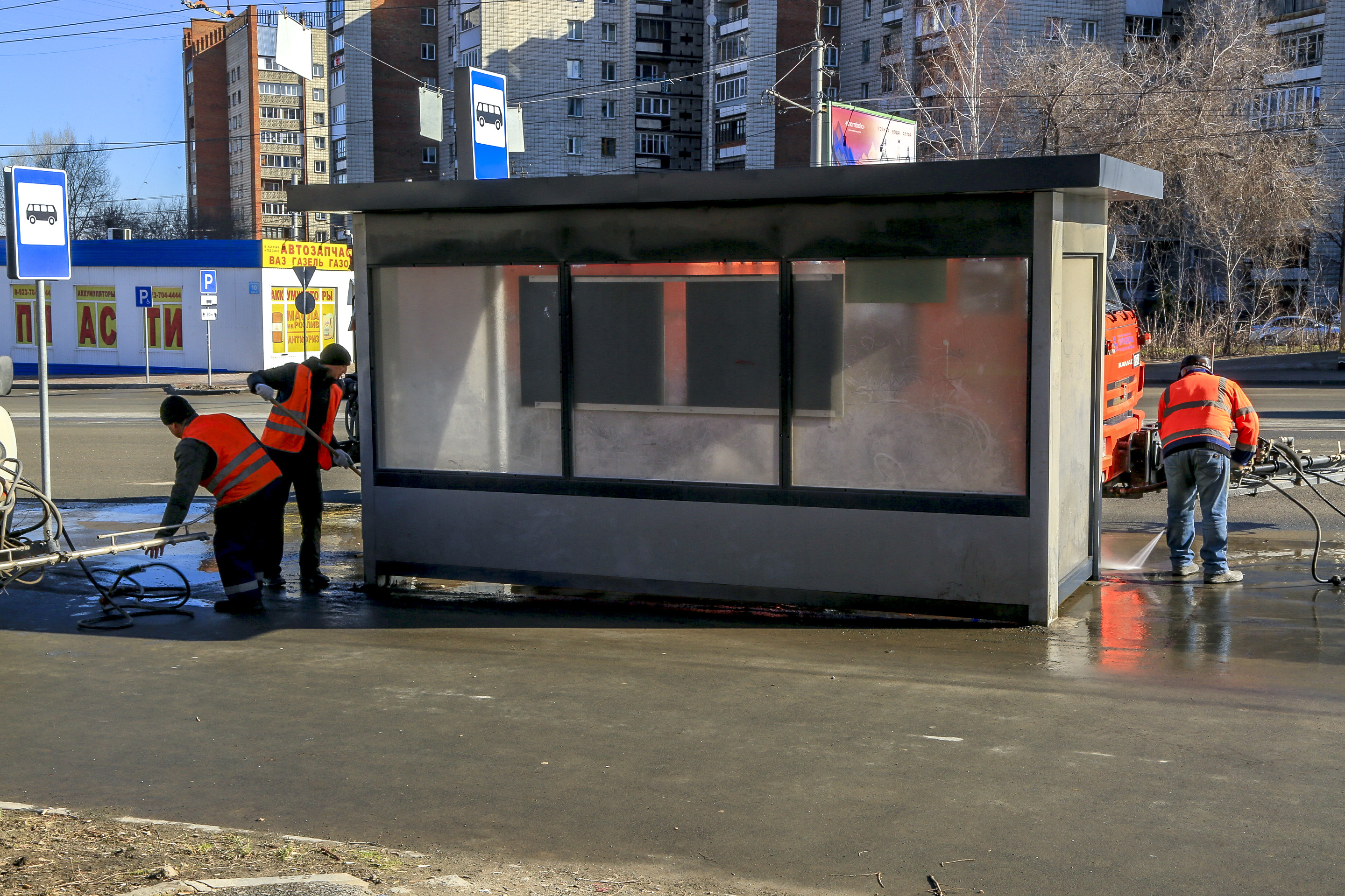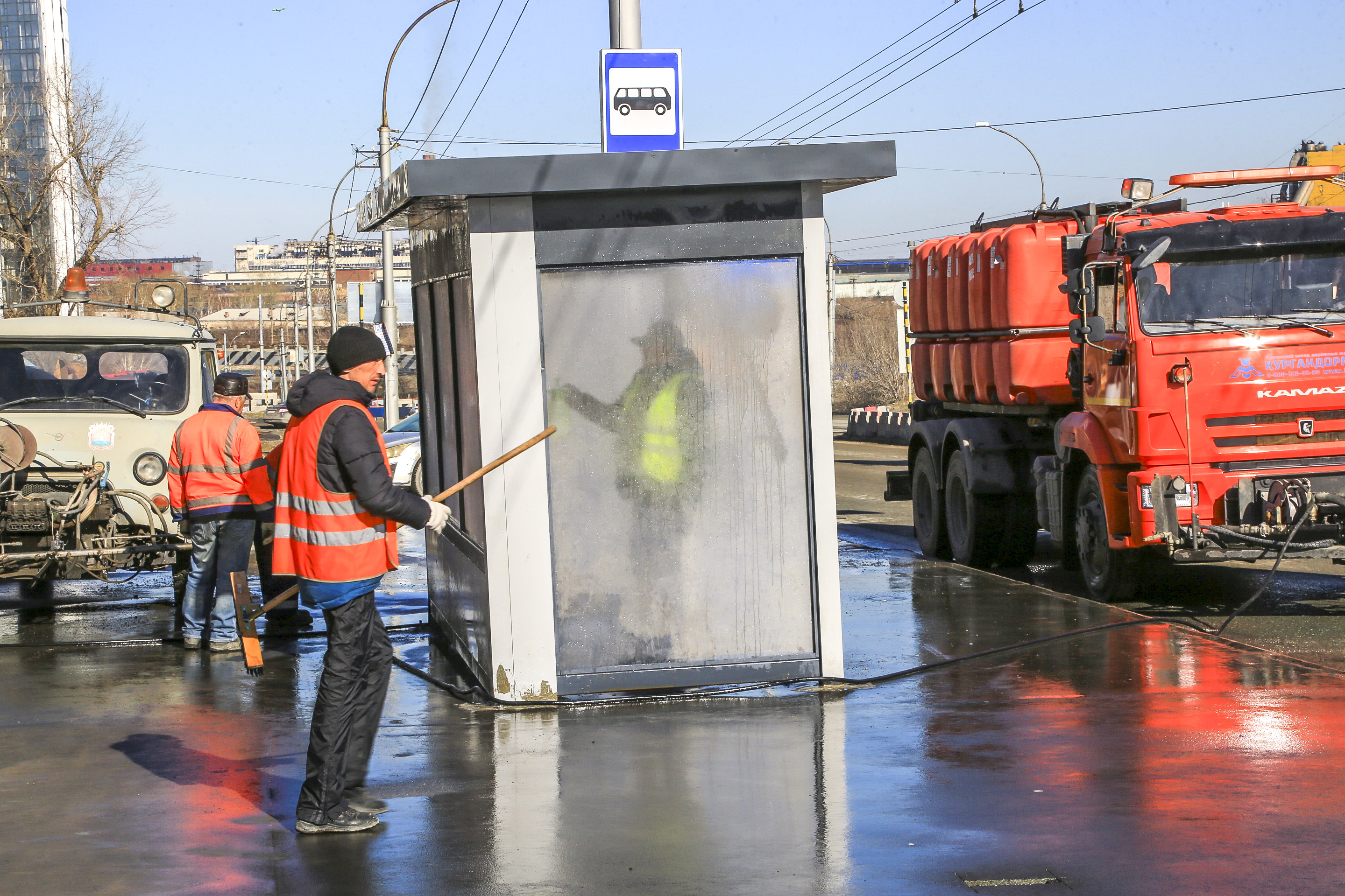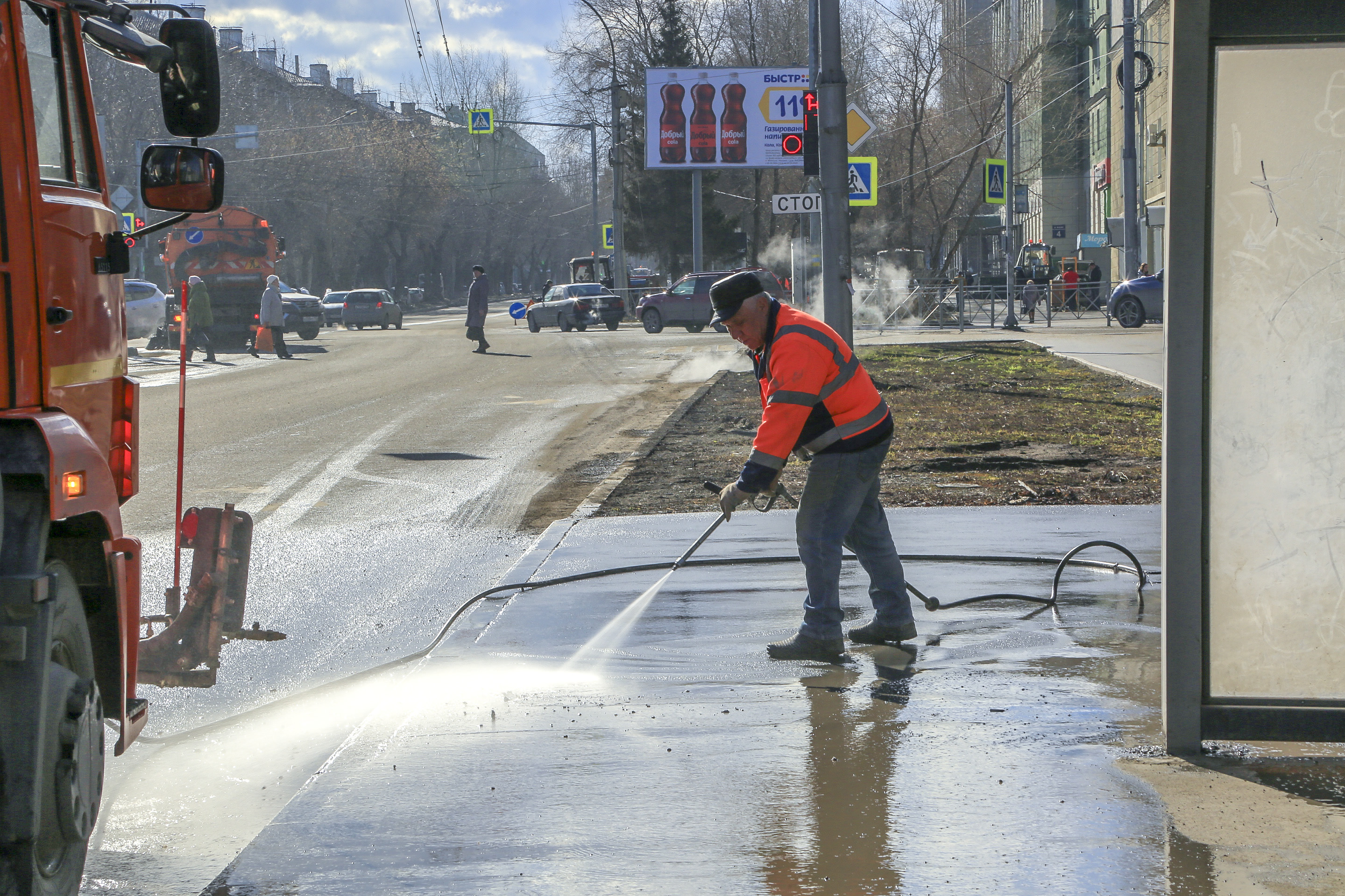 Комплексно подойти к уборке улиц решили в Ленинском районе Новосибирска. Мусор и грязь убирают и на газонах, и на тротуарах, и с проезжей части. Параллельно моют остановочные павильоны, обрезают мешающие ветки деревьев.