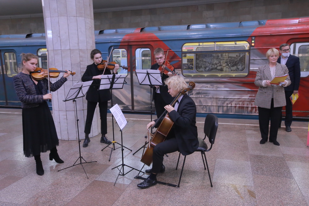 На платформе станции метро «Площадь Гарина-Михайловского» играют музыканты новосибирского академического симфонического оркестра. В этом году прославленный коллектив отмечает свой юбилей.