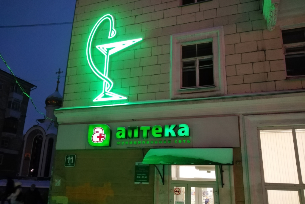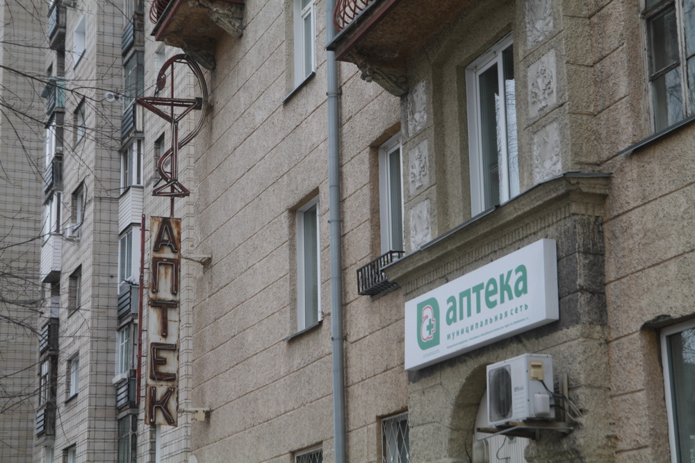 В прошлом году на фасаде дома №11 на улице Сибиряков-Гвардейцев засветилась зелёным неоном старая чаша Гигеи со змеёй — главный символ медицины в СССР. Инициатором восстановления конструкции стала муниципальная аптечная сеть. К слову, ещё одну похожую вывеску планируют реанимировать у аптеки на Геодезической, 9.