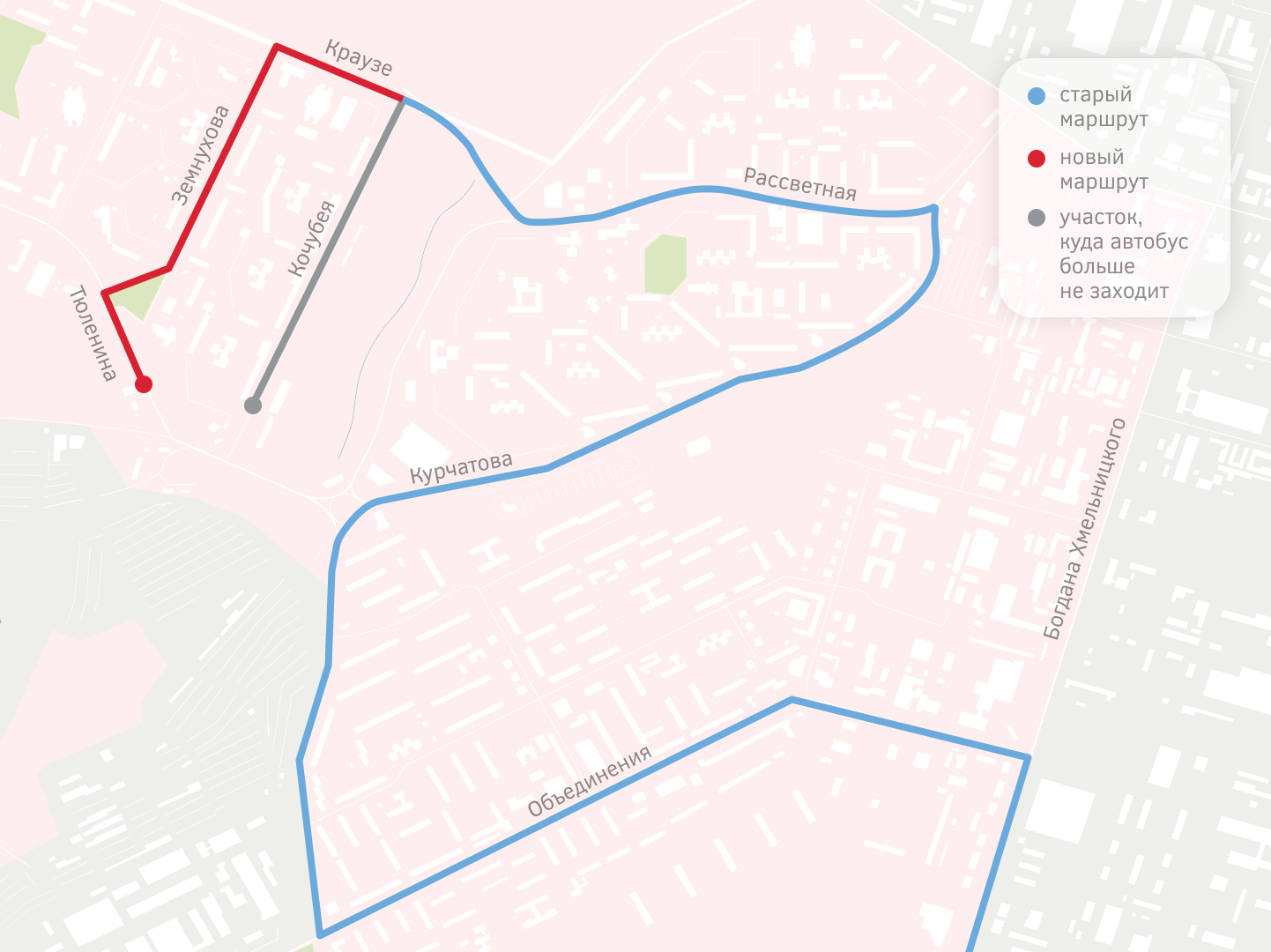 С 18 августа при движении по Родникам автобус №13 больше не будет сворачивать с улицы Краузе на Кочубея, а вместо этого проедет чуть дальше по Краузе, потом свернёт на улицу Земнухова, а по ней пойдёт до Тюленина.