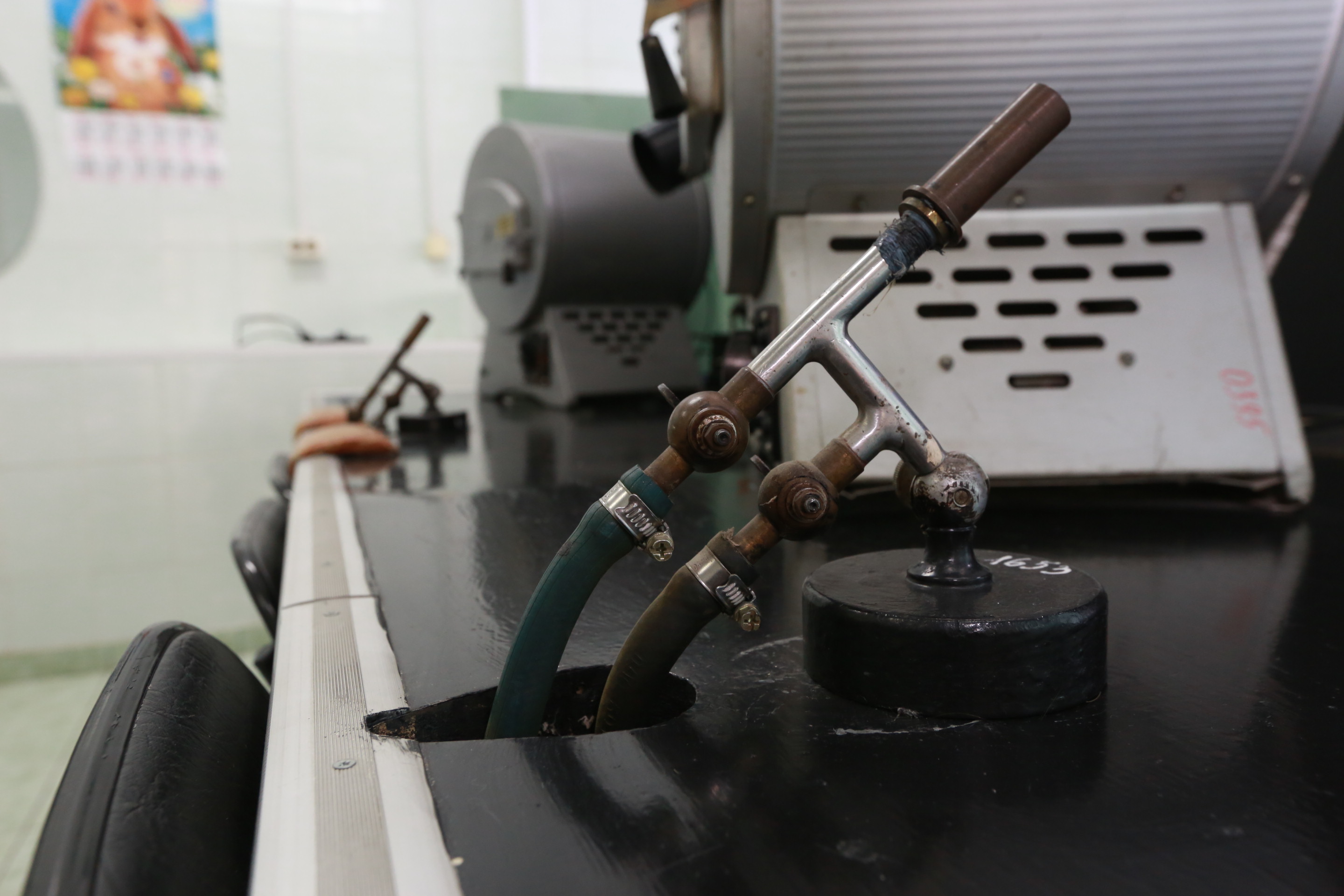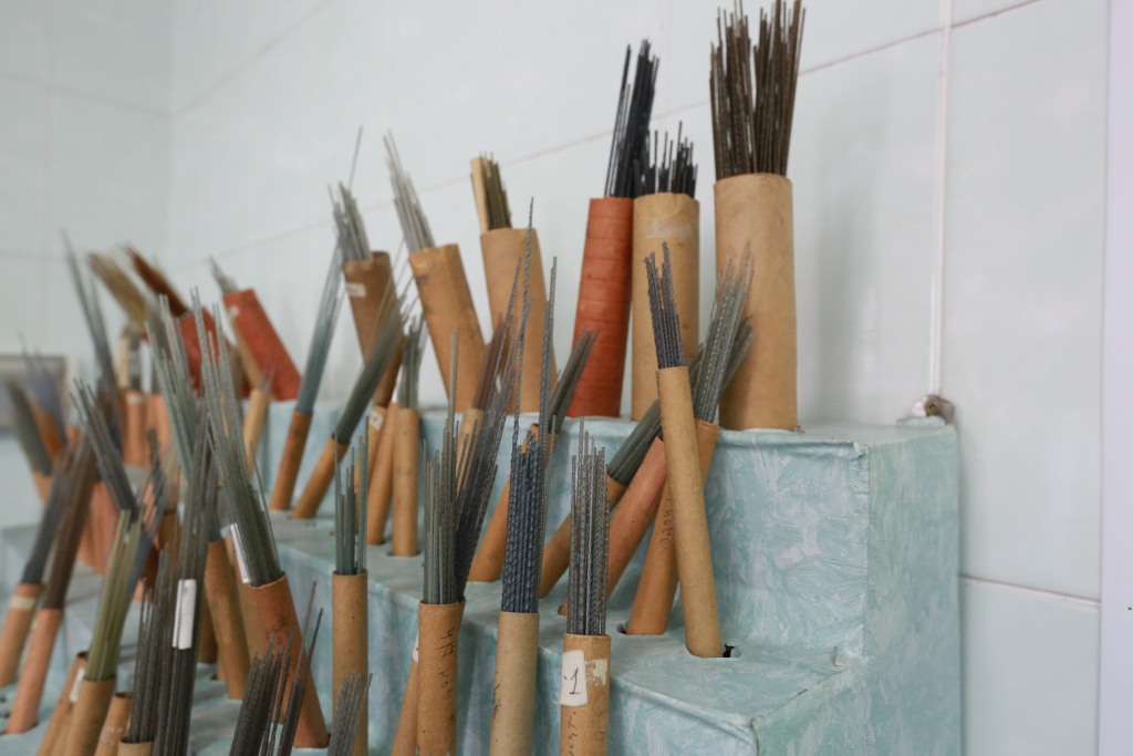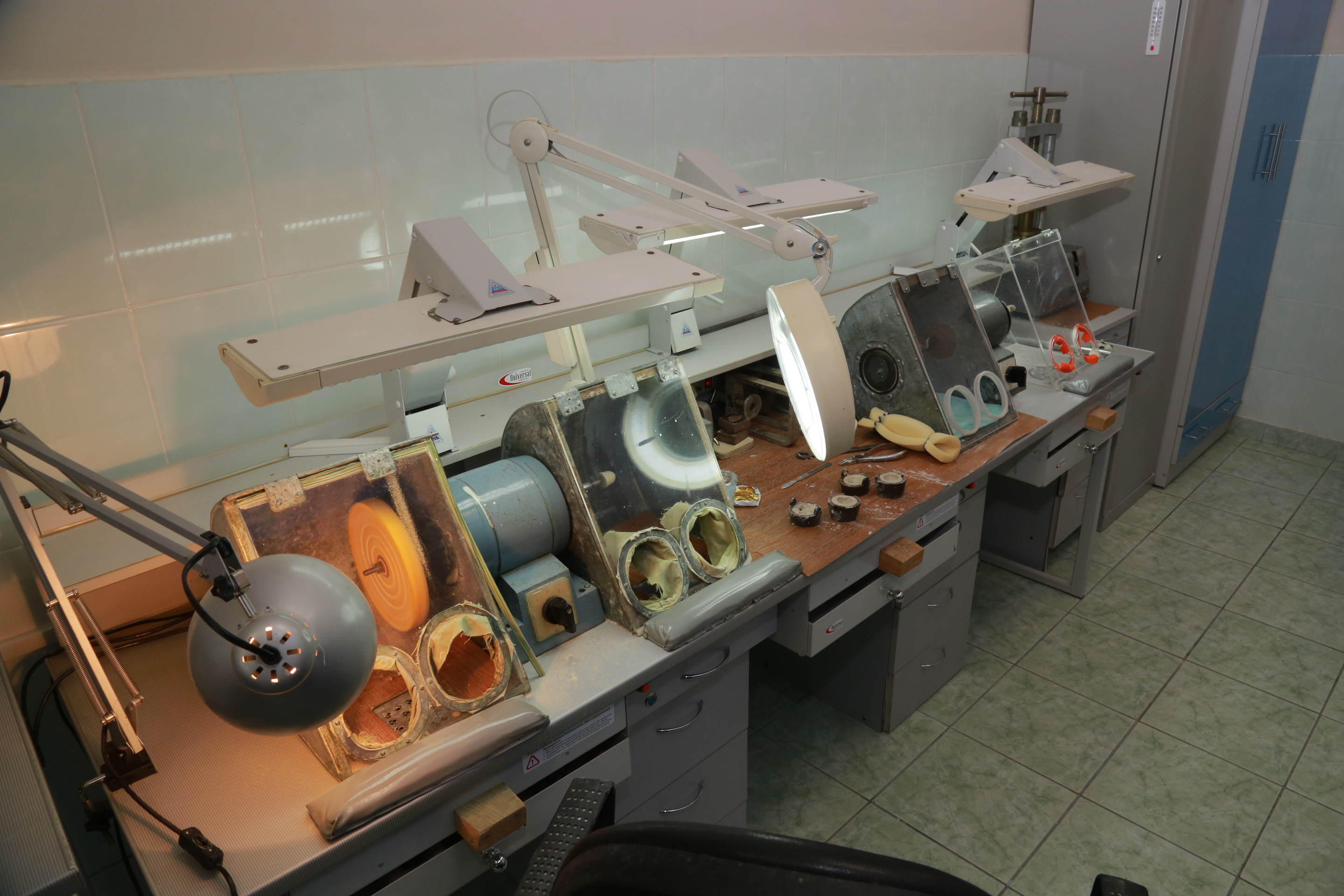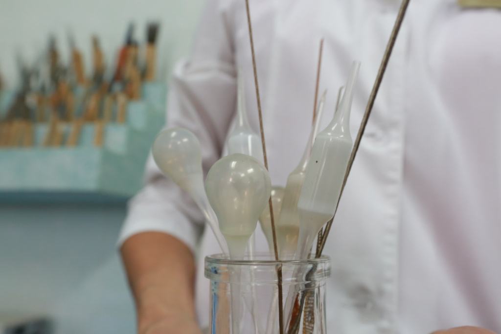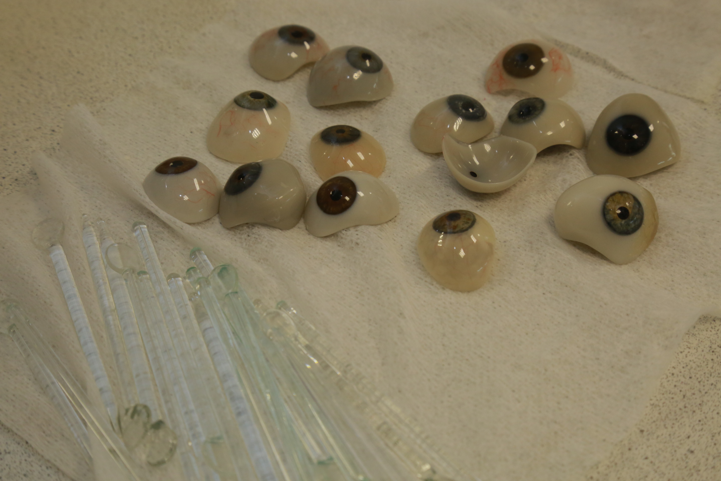 В глазопротезной мастерской — целые ящики с непрозрачными трубками. Из них делают глазные яблоки. Белый цвет у них разных оттенков. Каждая трубка — примерно 20 «глазок». Правда, на пенсию ушла опытный стеклодув, молодёжь, желающую учиться этим премудростям, ещё не нашли. Рабочий стол ждёт нового профессионала.
