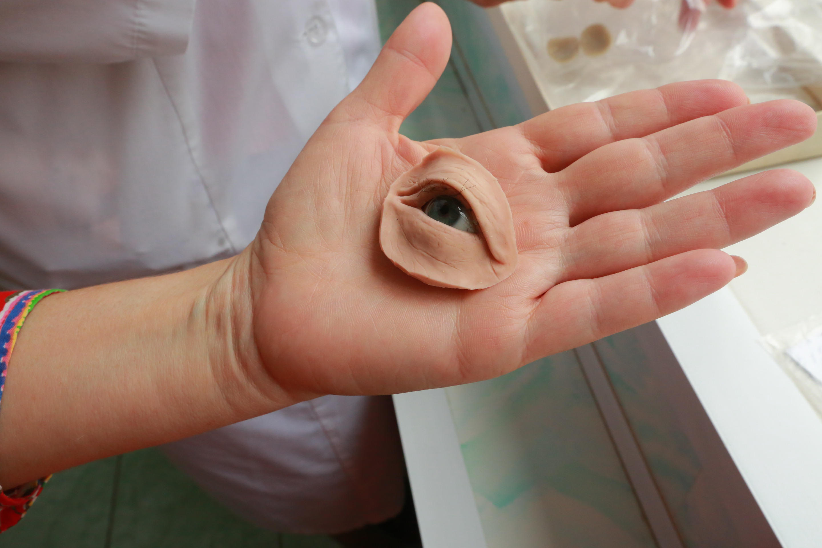 «Бывает так, что протезированием глаза не обойтись. Например, злокачественная опухоль „съела“ часть орбиты — кость вокруг глазницы. Яма внутри лица „дышит“ вместе с человеком и пугает окружающих. Или был химический ожог. На женщину в порыве ревности вылили кислоту — она уничтожила не только глаз, но и часть лица. В этом случае протезируем глаз и часть лица тоже. Это называется эктопротез. Его крепят на медицинский или гримёрный клей. Кожные складочки наш мастер делает из силикона, он на ярком солнце теряет цвет. Мой любимый пациент подкрашивает свой эктопротез тональным кремом жены. Простой изящный способ», — рассказывает Елена Савинова.