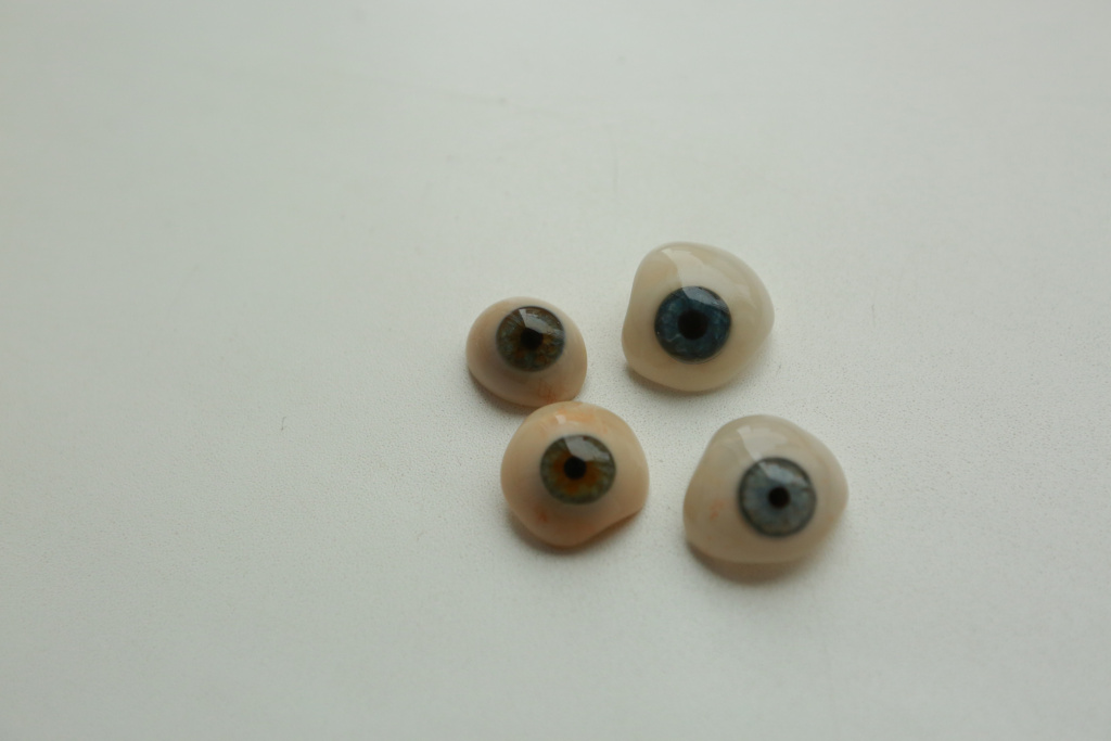 Первый материал для искусственных глаз — стекло. Протезы из него были у средневековых венецианцев, такие до сих пор производят во Франции и Германии, а также в Москве, Хабаровске. Как шутят мастера, стеклянный глаз — близкий родственник ёлочной игрушки. Внутри он всегда полый. Стеклодув выдувает протез, а потом высасывает из него воздух ртом через трубку. Рецепт глазного стекла всегда оставался семейной тайной мастера, химический состав не такой, как у материала для окон или посуды.