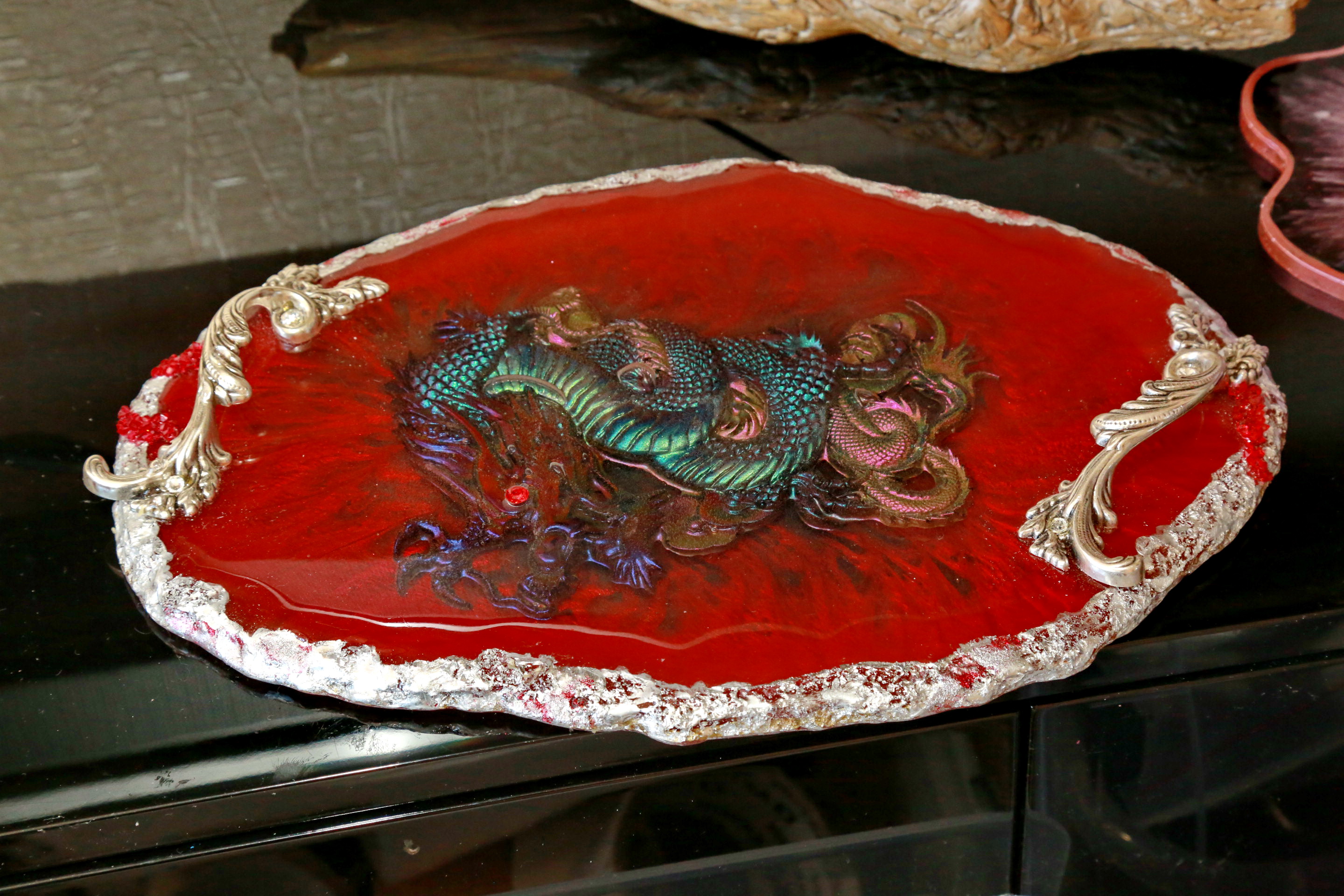 Скрипки, птицы, рыбы, гранаты, драконы, цветы — эпоксидка может принять любую форму и превратиться в самый неожиданный предмет: заколку, украшение, картину, посуду и даже стол. Этот материал можно сочетать с деревом, текстурной пастой, сухоцветами, шишками и кофе. Но часы — признаётся Елена — самый любимый творческий объект.