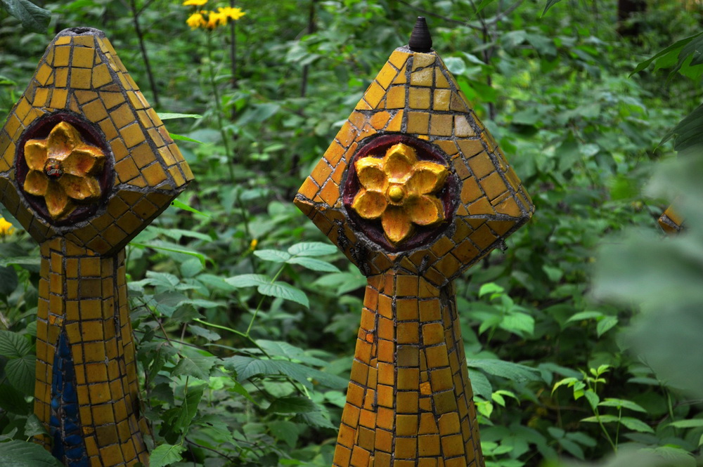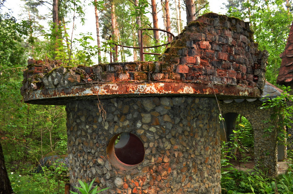 На входе, как символ эпохи космонавтики, стоит советская ракета. На территории есть горки, детские качели, замок и заброшенный фонтан.