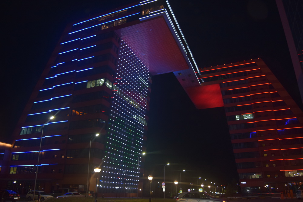 Технопарк в Академгородке является одним из таких мест. Его называют ночным Лас-Вегасом из-за необычной подсветки. Наклонные башни, соединённые на уровне 13-го этажа переходной галереей нависают прямо над проезжей частью улицы Николаева. За характерный силуэт это здание в народе прозвали «гусями».