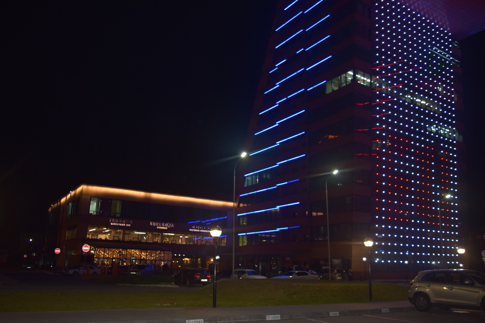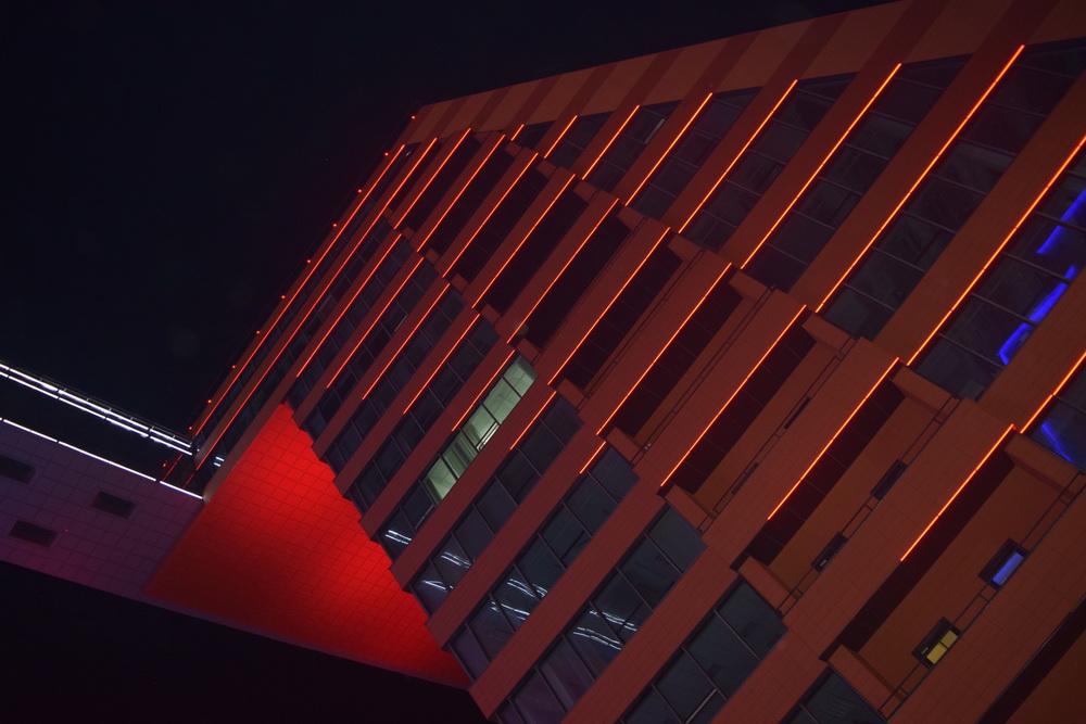 Колонны внутри здания тоже подсвечивают и их можно увидеть сквозь стеклянные стены. Цвет у колонн периодически меняется и на барельефах можно рассмотреть необычные изображения летучих мышей, оленей и других этнических животных.