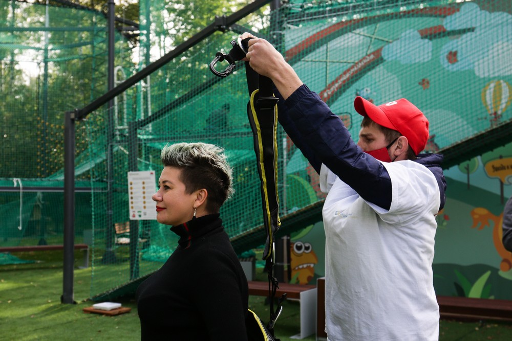 После прыжка на площадке финиша тебя «поймают» инструкторы. Чтобы снять карабин с троса, придётся снова встать на скамеечку.
