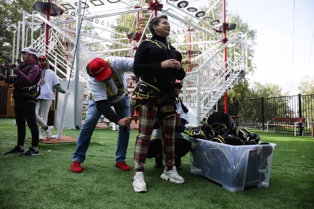 Каждого смельчака, который решился прыгнуть, здесь встречают как настоящего героя. Уже на входе инструкторы начинают подбадривать и психологически готовить тебя к прыжку. Кстати, всё время, пока ты находишься на площадке аттракциона, с тобой рядом есть сопровождающие. Они помогают надевать специальное снаряжение, провожают тебя наверх и прикрепляют к тросу.