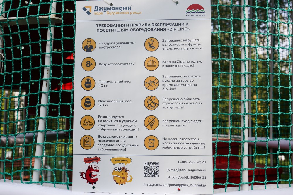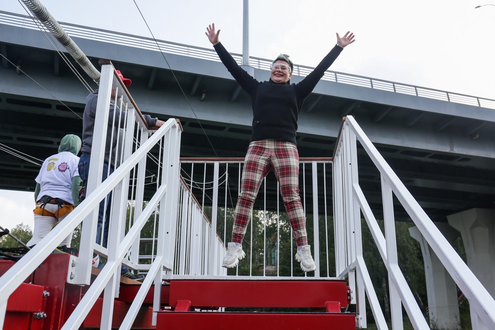 На аттракцион пускают детей от восьми лет. Перед прыжком у тебя обязательно спросят про самочувствие, кроме того, тебя взвесят. Максимально возможный вес прыгуна — 130 килограммов, минимальный — 40 килограммов. Кстати, чем больше вес, тем больше разгоняешься на трассе. Люди миниатюрные могут не долететь до финиша и зависнуть в воздухе. Для таких случаев есть механизм подтягивания троса.