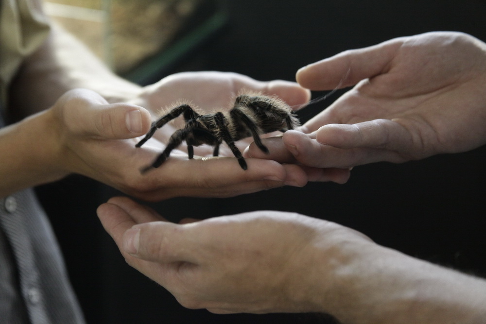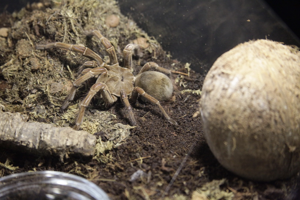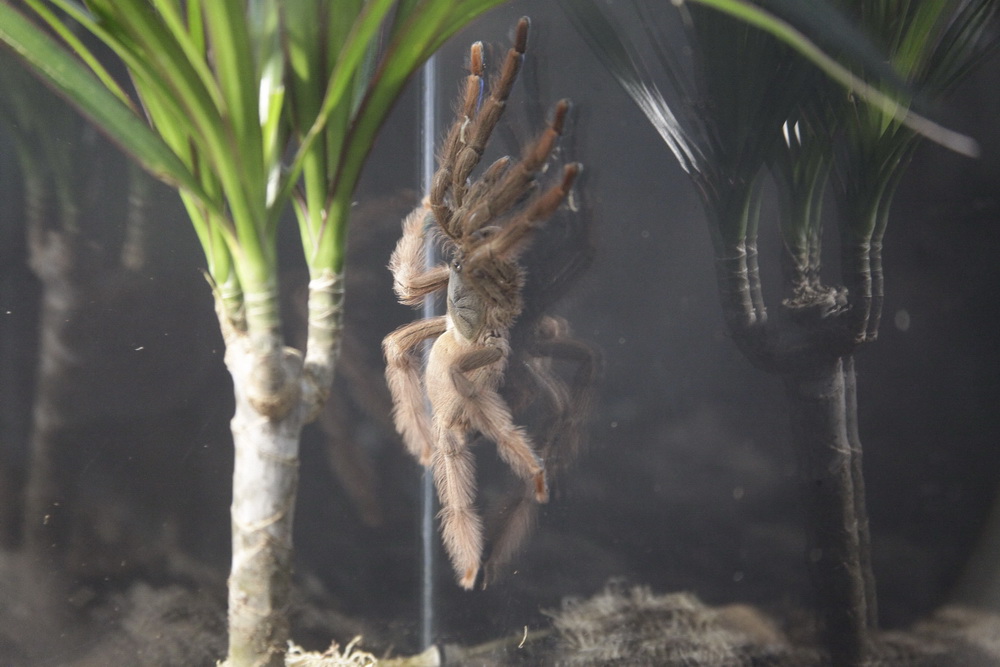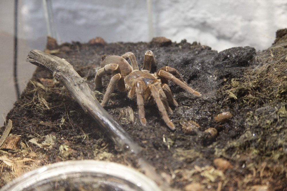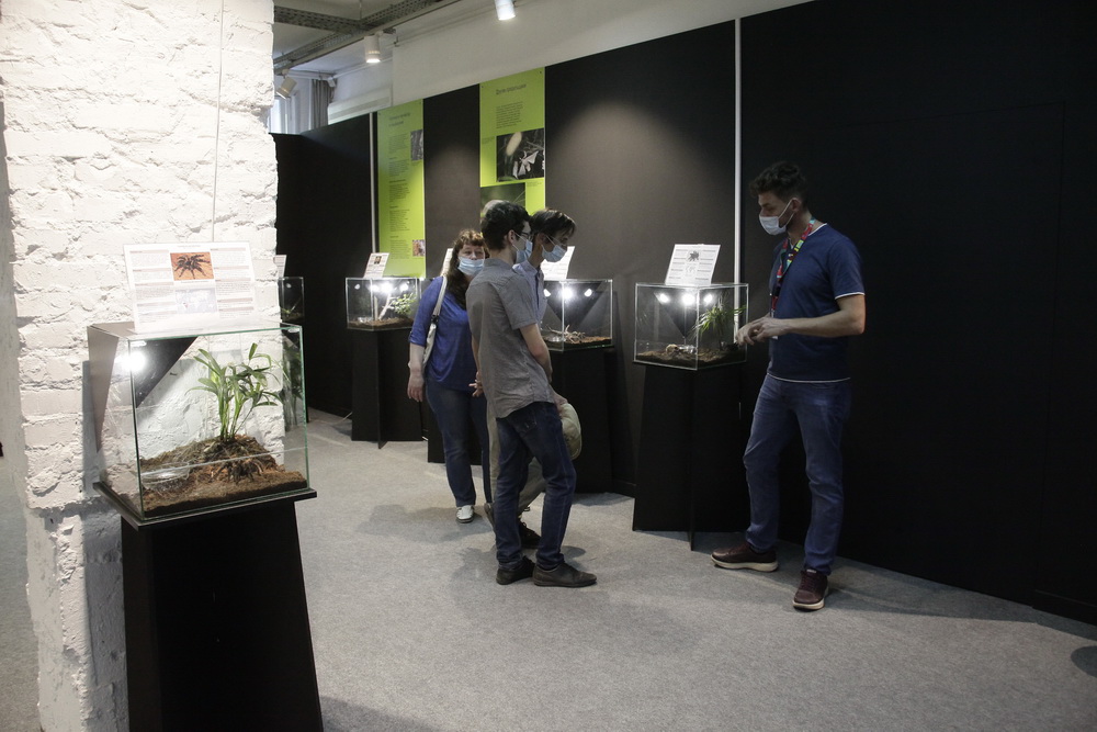 На выставке можно увидеть паука-птицееда. Его тело покрыто чёрно-бурыми и тёмно-рыжими волосами. Длина достигает десяти и более сантиметров. Несмотря на название, птиц он ест в исключительных случаях. В рационе — насекомые, мелкие грызуны и лягушки.