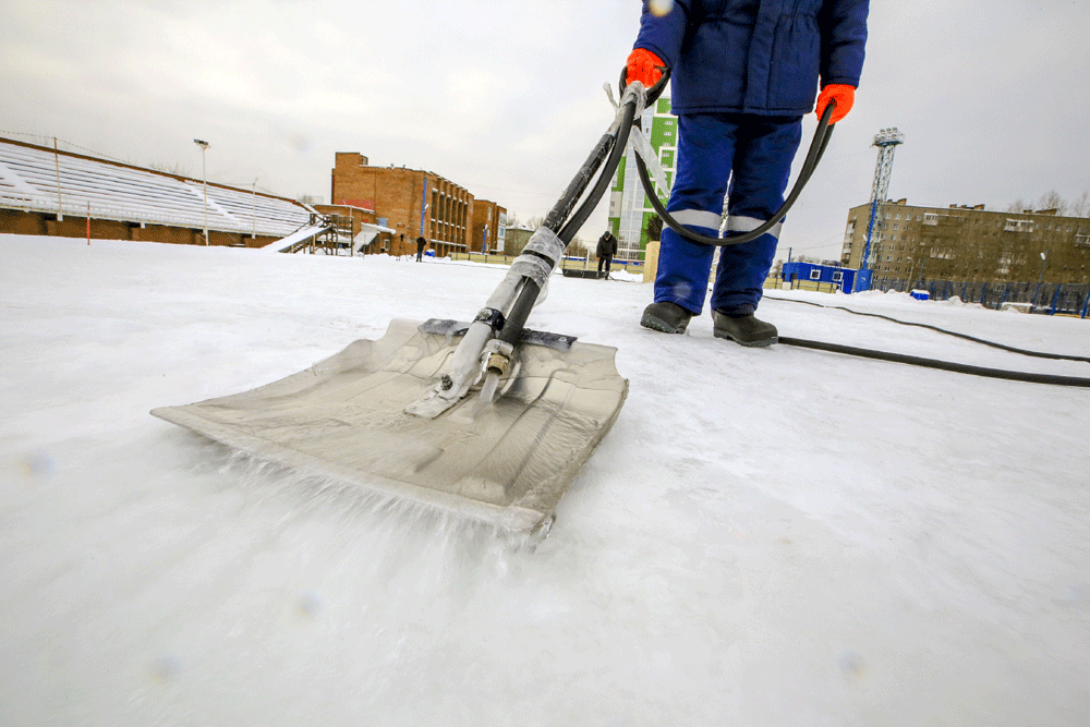 Рабочий в течение зимы следит за катками и хоккейными коробками — проводит заливку, разметку, раскраску, очистку льда от снега, зачистку трещин и так далее.