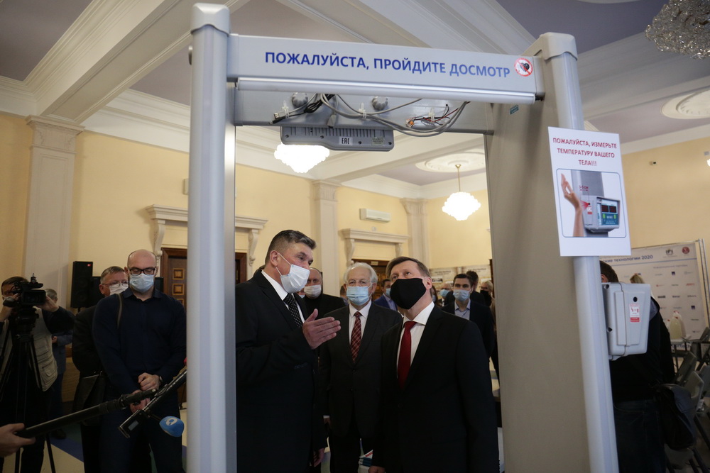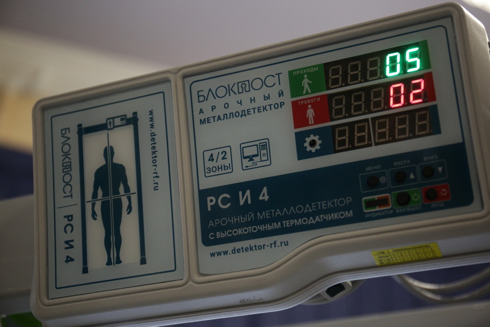 Новосибирские компании быстро отреагировали на запрос времени. Одна из них даже предложила совместить рамку металлоискателя с термометром. Здесь находится устройство для измерения температуры тела, которое мгновенно оценивает ваше состояние. Зажглась зелёная лампочка — значит, всё в порядке, можно проходить. Если при проходе слышим сигнал, это означает, что у человека есть металл или запрещённый предмет.