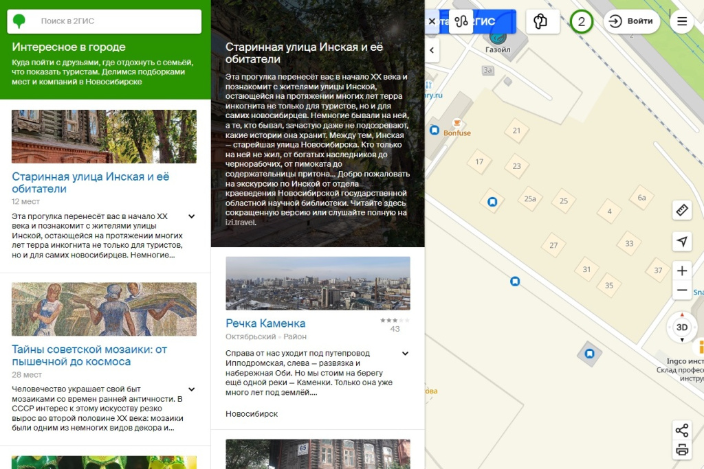 В информационном сервисе 2ГИС появился путеводитель от краеведов Новосибирской областной научной библиотеки. С ним можно отправиться на прогулку по одной из старейших улиц нашего города — Инской. Серия карточек с краткими текстами буквально переносит в прошлое.