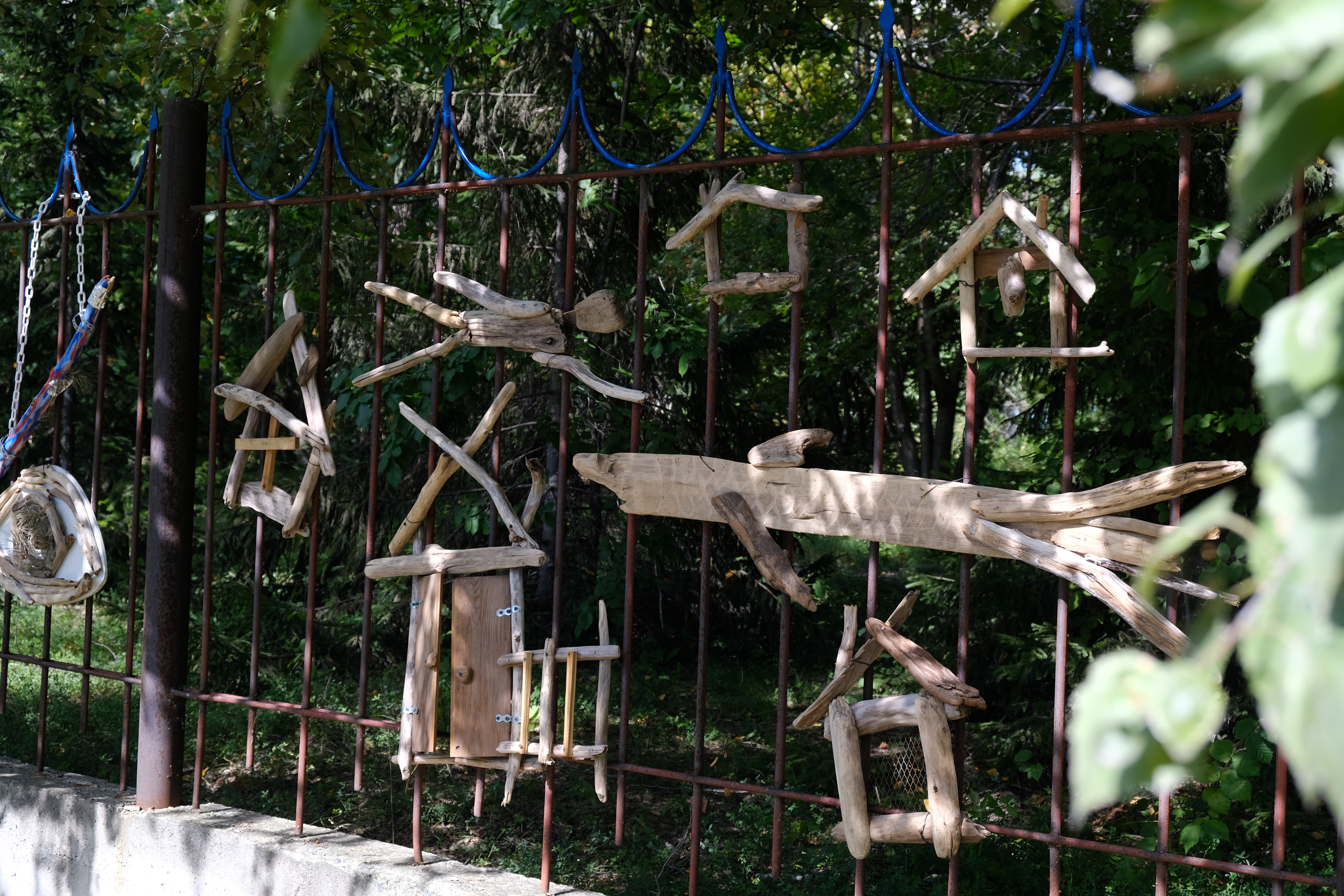 Марьям Гулиева: Вот и создали целых три штуки! Про мегалодона художница придумала свою легенду. Есть факт, что в 1882 году возле города Камень-на-Оби произошло землетрясение, из-за чего образовался Бердский региональный разлом. И она придумала, что во время этого землетрясения мегалодон, который спал все эти тысячелетия, проснулся, выплыл, но не смог выжить в нынешних условиях, и вот его останки теперь покоятся на берегу Обского моря. Это, кстати, очень красивый большой арт-объект. Он соединяет в себе аэрографию и работу с топляком. То есть голова мегалодона нарисована на старом кафе, а дальше, где идут решётки, расположен скелет из длинных палок, которые прибило к берегу. Такое соединение стилей тоже очень красиво смотрится.