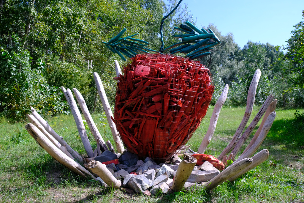 Марьям Гулиева: Не хотелось бы что-то выделять, потому что каждый постарался — и взрослые художники, и молодые ребята из паблик-арт-школы, и я, в том числе, — там есть один мой арт-объект. Но, наверное, вернёмся к нашей клубничке, о которой мы говорили во время прошлой беседы — она первой встала на арт-тропе, а также она стала символом фестиваля. У нас был мерч для участников, и там, на футболках, изображён эскиз нашей клубнички. Думаю, что это действительно самый яркий объект. Он яркий по цвету, он большой и с ним связан простой, но интересный факт: была клубника в Чемском боре, но потом исчезла. И, кстати, рядом с арт-объектом начала расти настоящая земляника, буквально в паре метров.