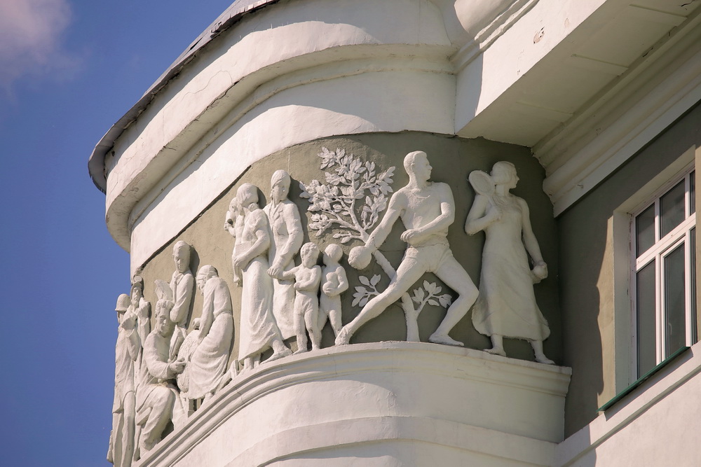 На фасаде здания огромными буквами были выведены слова: «Профсоюзы — школа коммунизма». Согласно эпохе, на барельефах, украшающих эркеры, изображались фигуры, символизирующие трудовую деятельность советских людей: шахтёры с отбойными молотками, студенты, матери с детьми — домохозяйки, сталевары за работой, спортсмены.