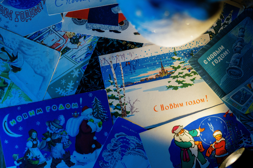 Егор Урюмцев: И здесь появляется интересная смычка. Сюжеты советских новогодних открыток можно разделить на три темы: Дед Мороз, детская тема и тема труда. Три тематические составляющие, которые проходят через все советские открытки. А на открытках писали не только «С Новым годом» и «С новым счастьем», но и «С новыми трудовыми успехами».