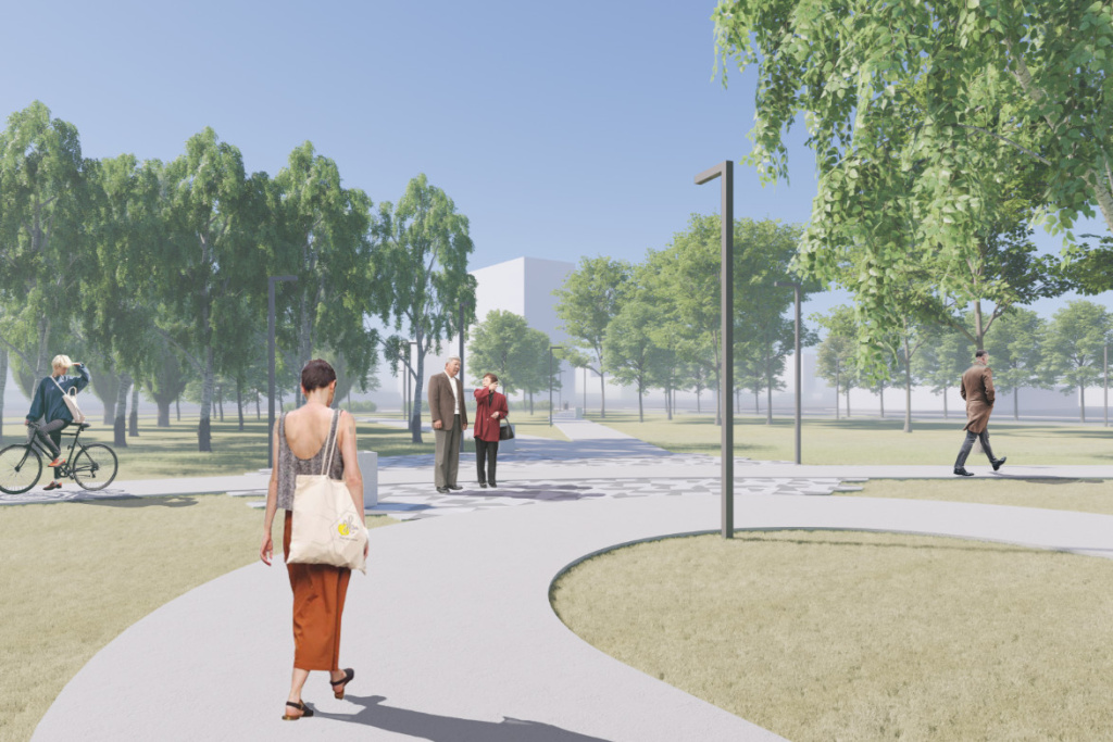 Разработчики предлагают заменить старое покрытие тротуарной плиткой «Оригами» в белом и сером цветах, поставить деревянные лавочки и обновить освещение. Круглую центральную площадь хотят украсить треугольными столбиками из стали с подсветкой, «отсылающими к духу места».