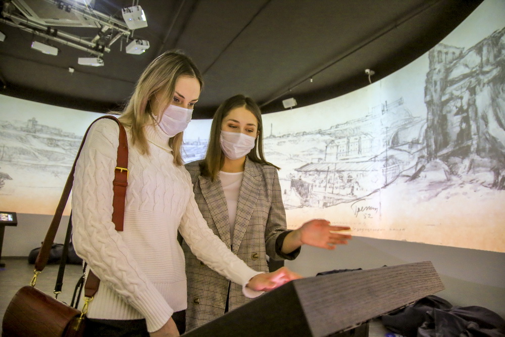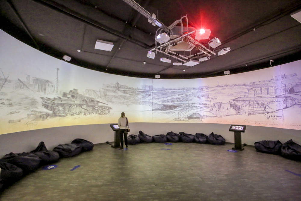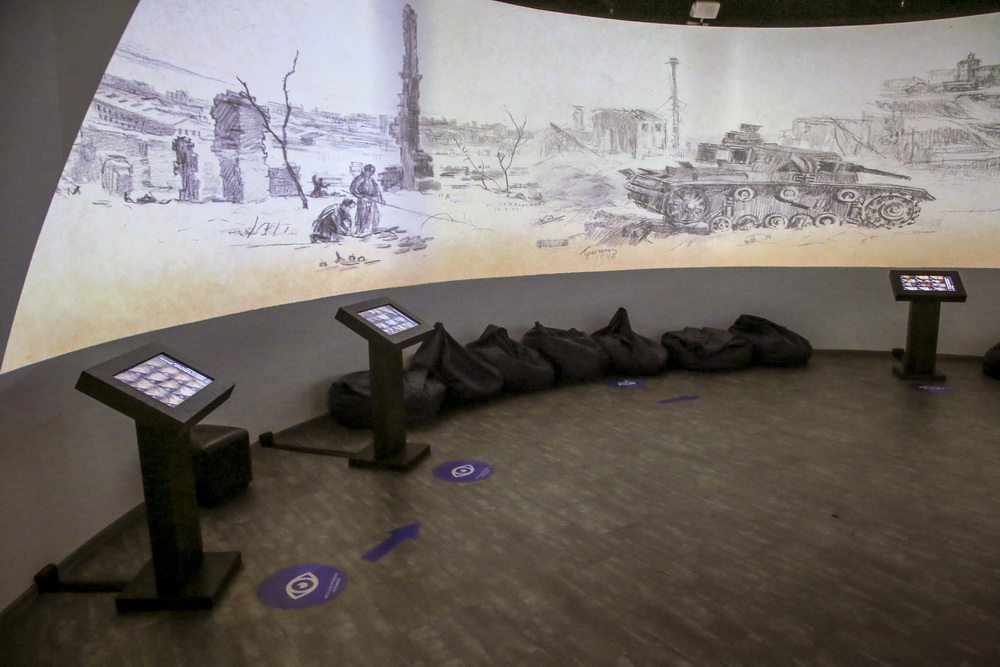 Портрет лётчицы Глафиры Алексеевны. В полку её называли просто Ирой. Художник по фамилии Высоцкий. Сбоку биография: где родилась, где воевала и как погибла при выполнении боевого задания. В выставочном зале — пять тачскринов с биографиями тех, кто готов был отдать свою жизнь за родину.