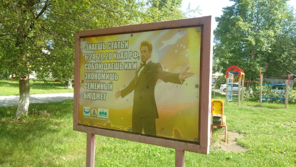 — Появилась идея сделать необычные плакаты. Взяли популярные мемы с актуальными фразами. Этот гласит, что на детских площадках курить и распивать алкогольные напитки запрещено. Одна картинка может иногда вмещать в себе философию нескольких книг.