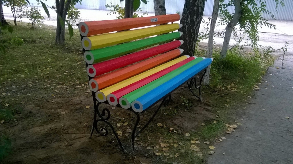 — Да, это первая лавочка, которую нам удалось поставить таким способом. Самостоятельно с товарищами мы эти деревяшки обрабатывали на станке. Думаю, в ближайшее время мы обновим краску. Будет по-прежнему радовать всех прохожих своим необычным видом.