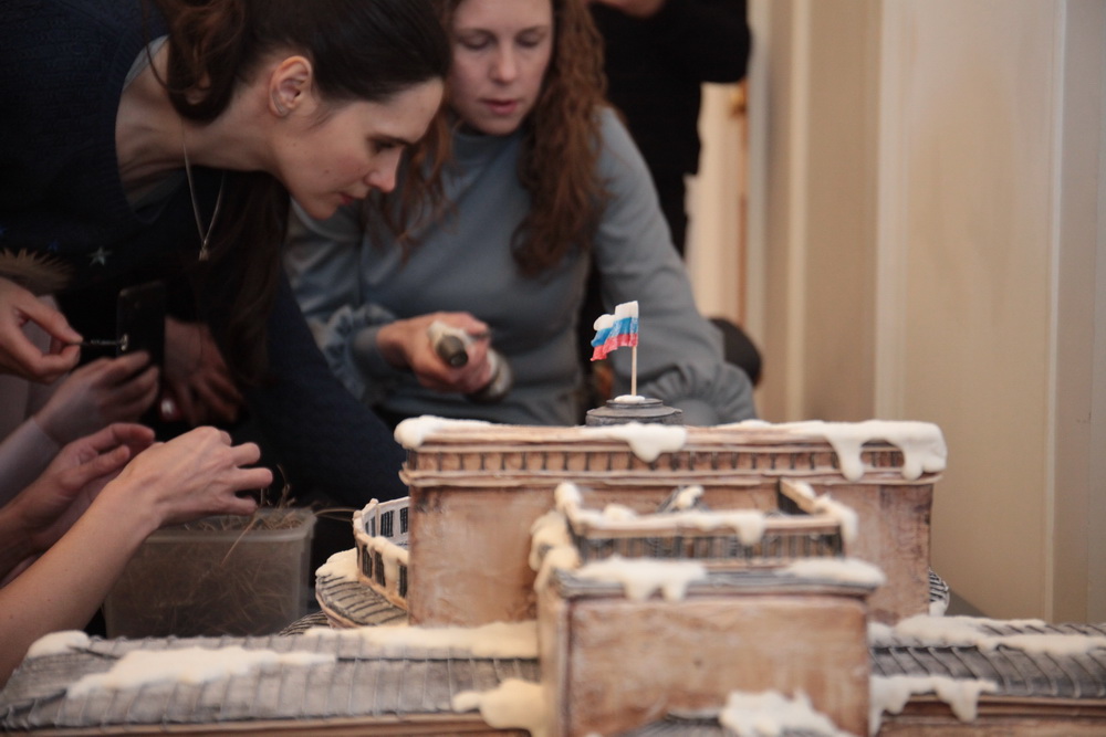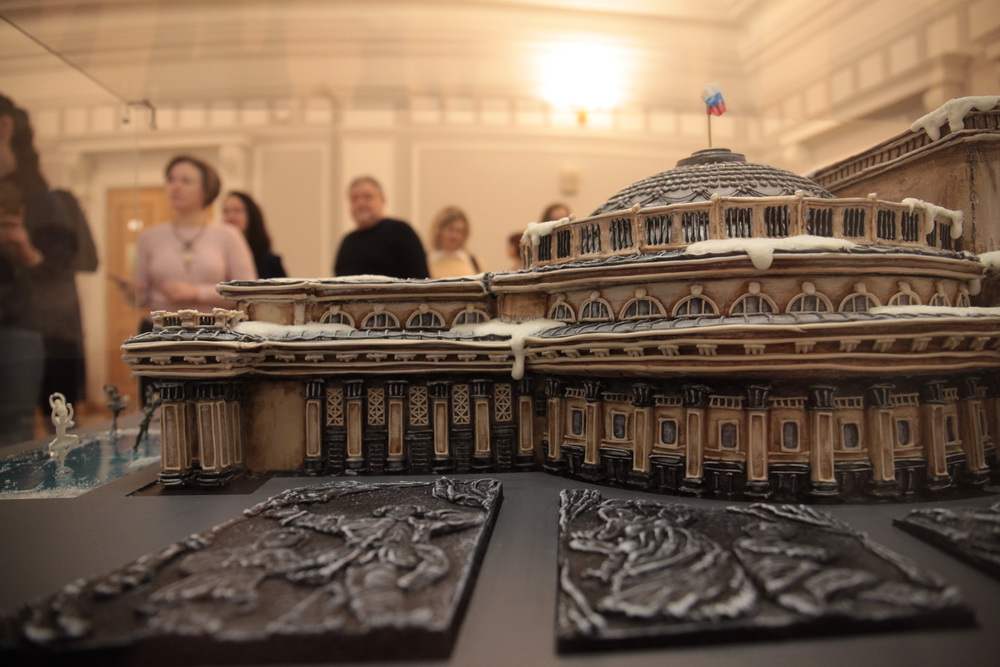 Последние штрихи — российский флаг на купол из мастики и фигурки балерин из глазури. Их прикрепили на прощание. Первые экскурсанты посмотрят на уникальный экспонат уже сегодня, заверили в оперном.