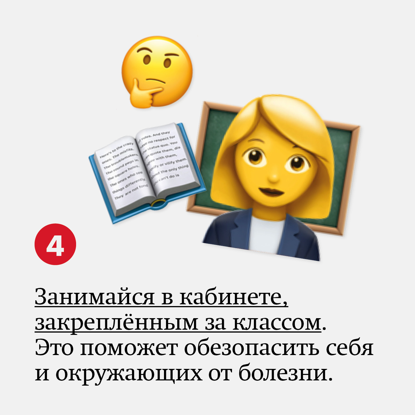 Пока не закончился период пандемии, все школьные занятия, за исключением физики, химии, труда, физкультуры, иностранного языка и информатики, должны проходить в специально закреплённом за каждым классом кабинете. Так нужно, чтобы обезопасить себя и окружающих от болезни — не забывай об этом.
