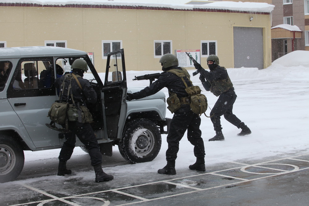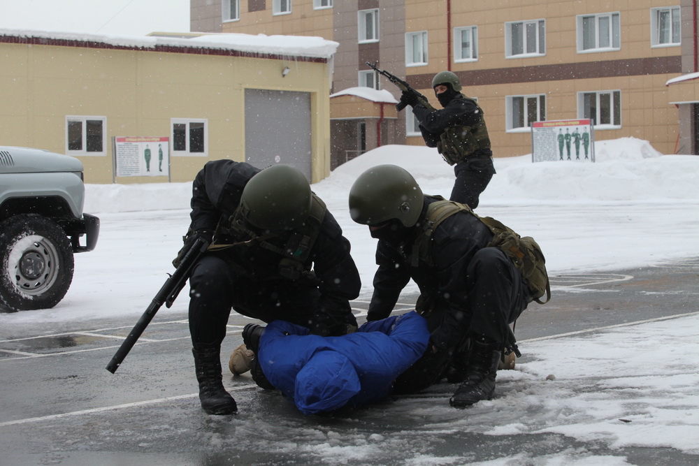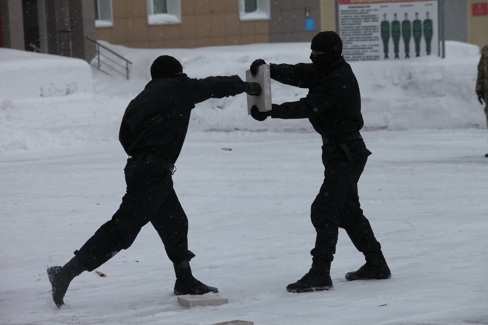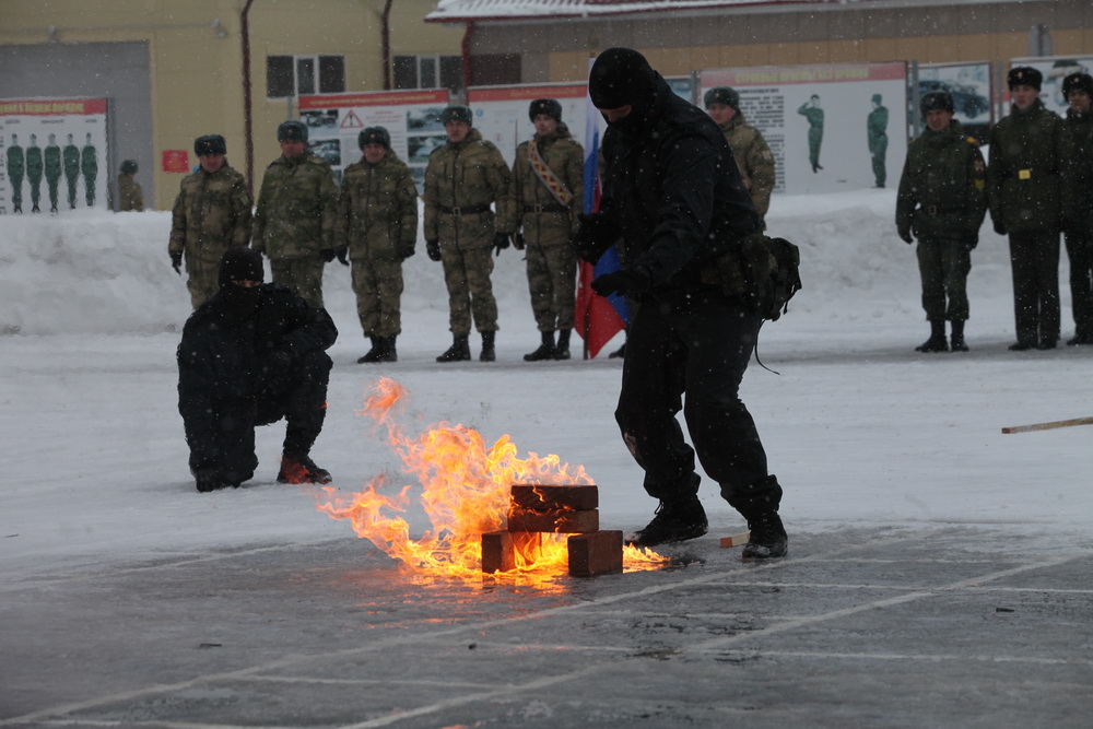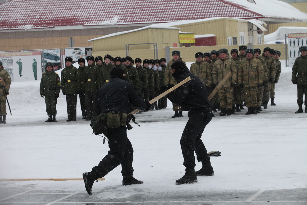 Отряд специального назначения национальной гвардии демонстрирует боевую мощь. Спецназовцы сначала задерживают противника, устроив арест прямо на плацу войсковой части, а затем показывают физическую силу.