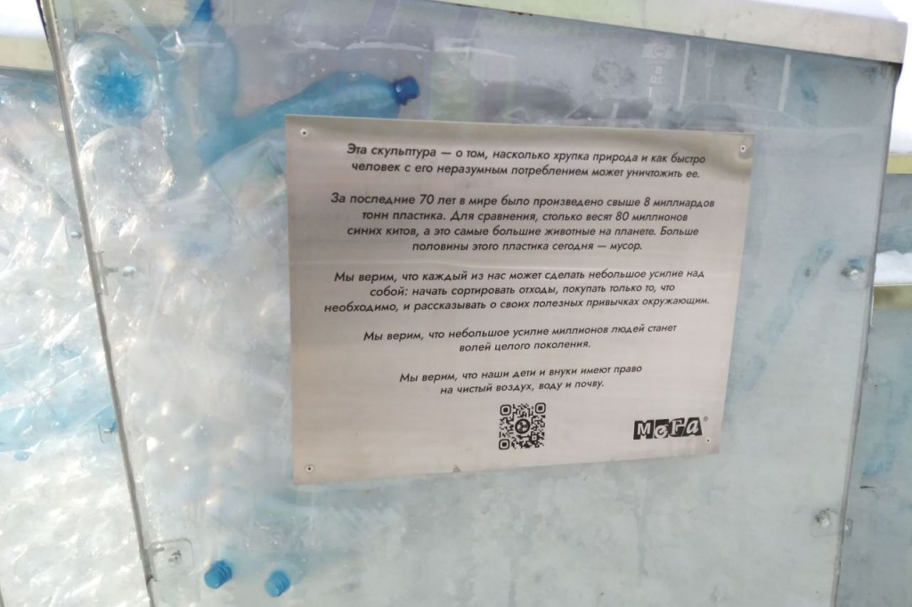 На информационной табличке есть объяснение происходящему. Там говорится, что за последние 70 лет в мире было произведено более 8 млрд тонн пластика. Это 80 млн синих китов — самых больших животных планеты. Больше половины этого пластика стало мусором.