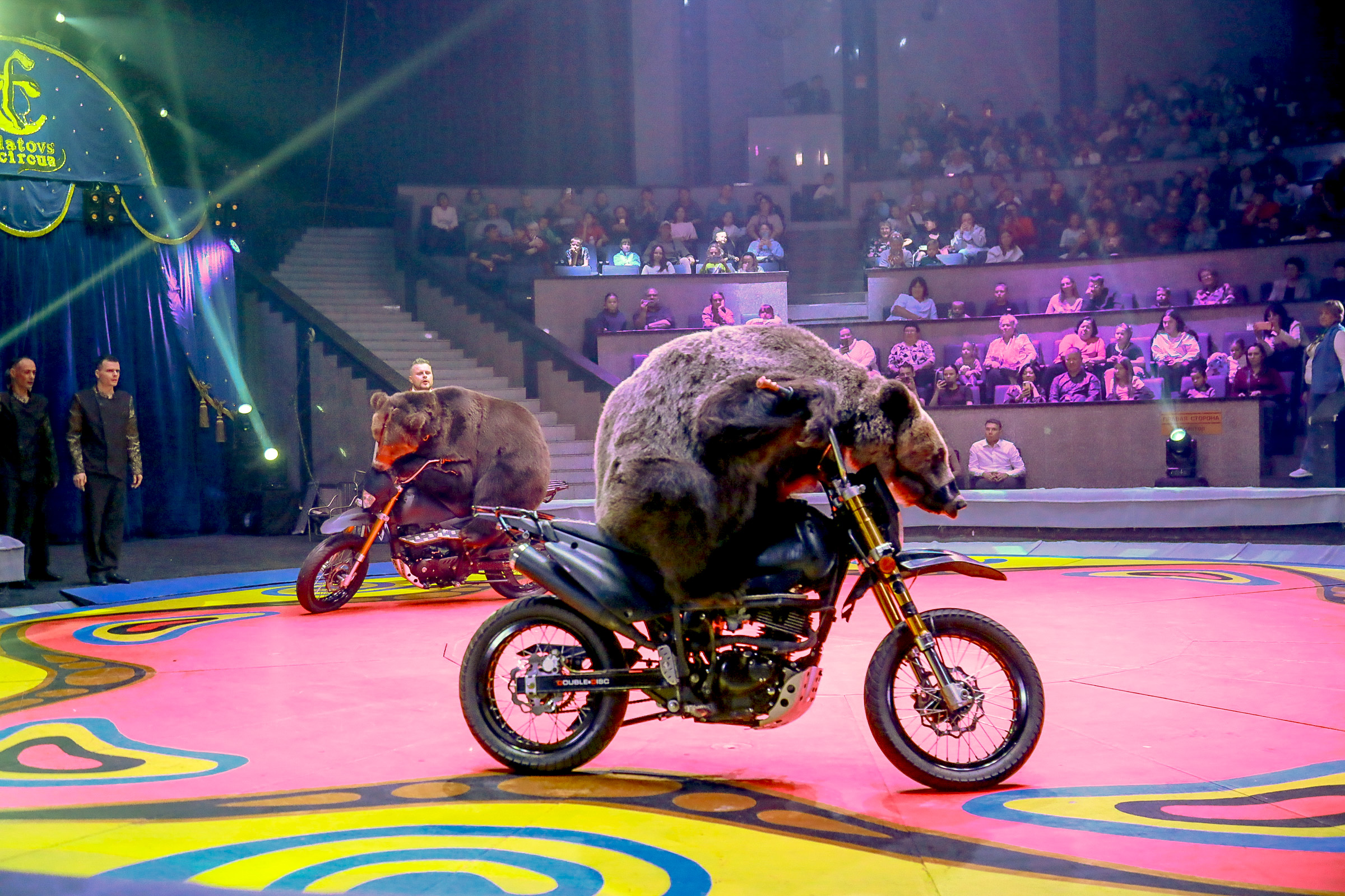 Мишки катаются на велосипеде, моноколесе, мотоцикле, самокате, жонглируют передними и задними лапами, а ещё танцуют на роликах и играют на балалайке. Этот аттракцион под управлением Александра Филатова был удостоен золотой награды на международном фестивале циркового искусства в 2020 году.