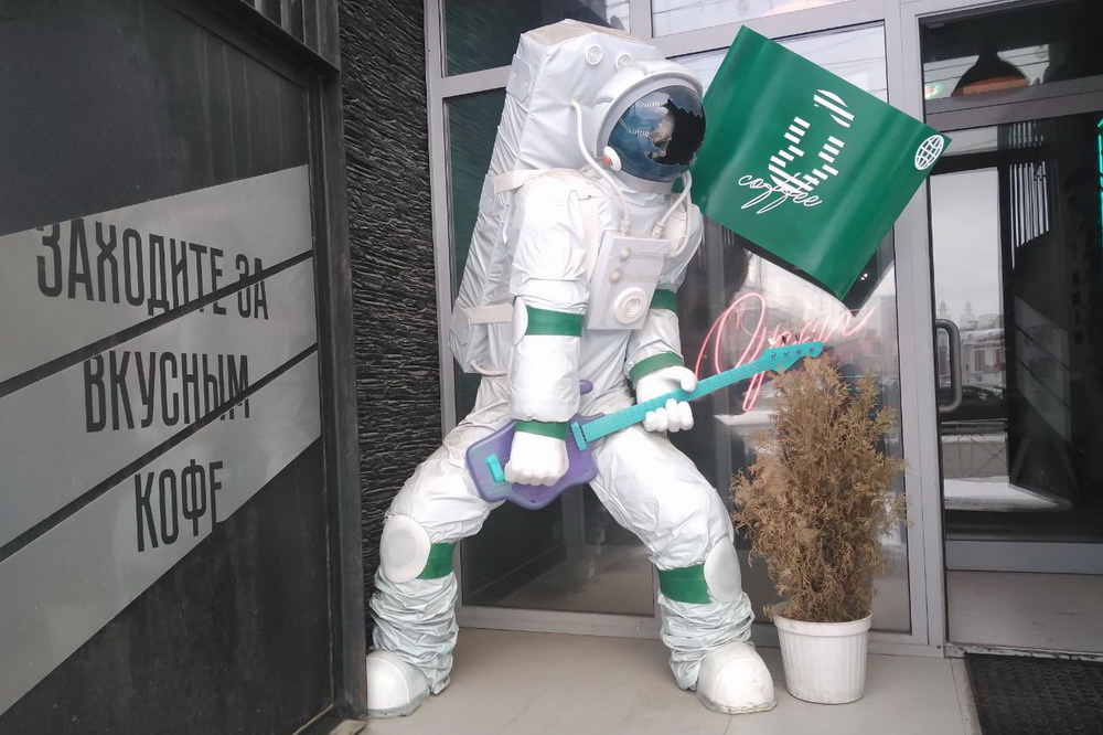 Двухметровый космонавт с электрогитарой украсил вход в кофейню Utopian на площади Ленина.