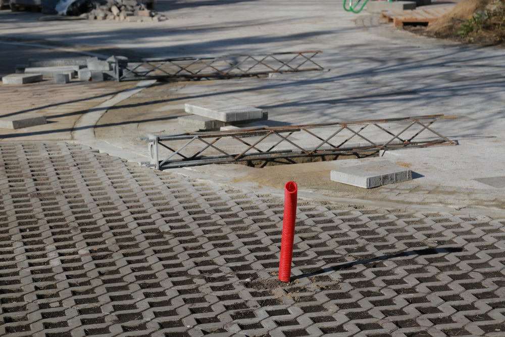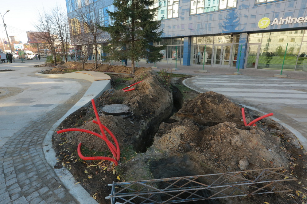 Так, рабочие выкапывают траншеи для укладки кабеля — все провода в сквере будут спрятаны под землю. Затем установят новые опоры освещения, к электричеству их подключат в ближайшие недели. Фонари в сквере будут напоминать самолёты. Тематику поддержат парковые качели и арт-объекты.
