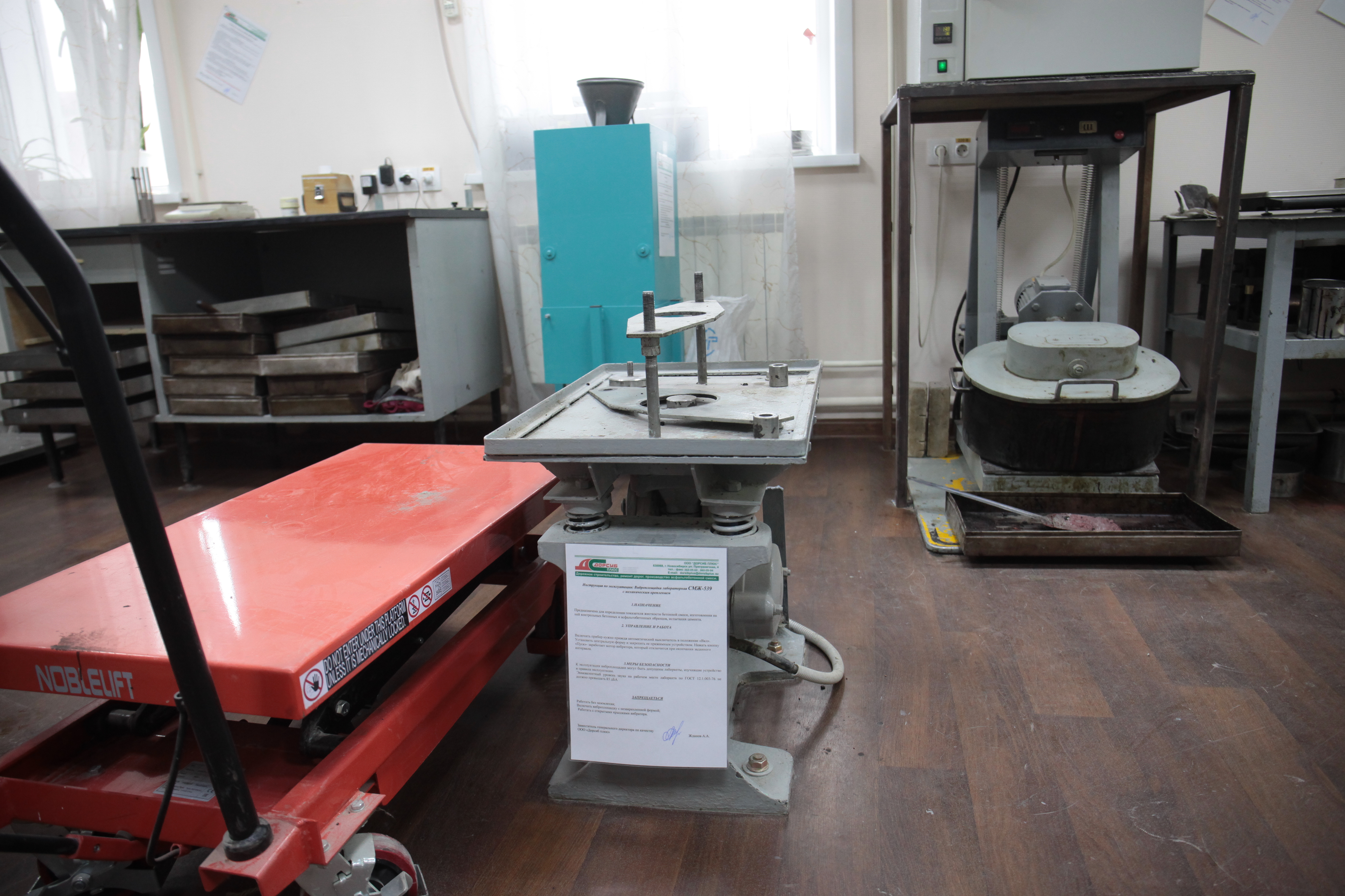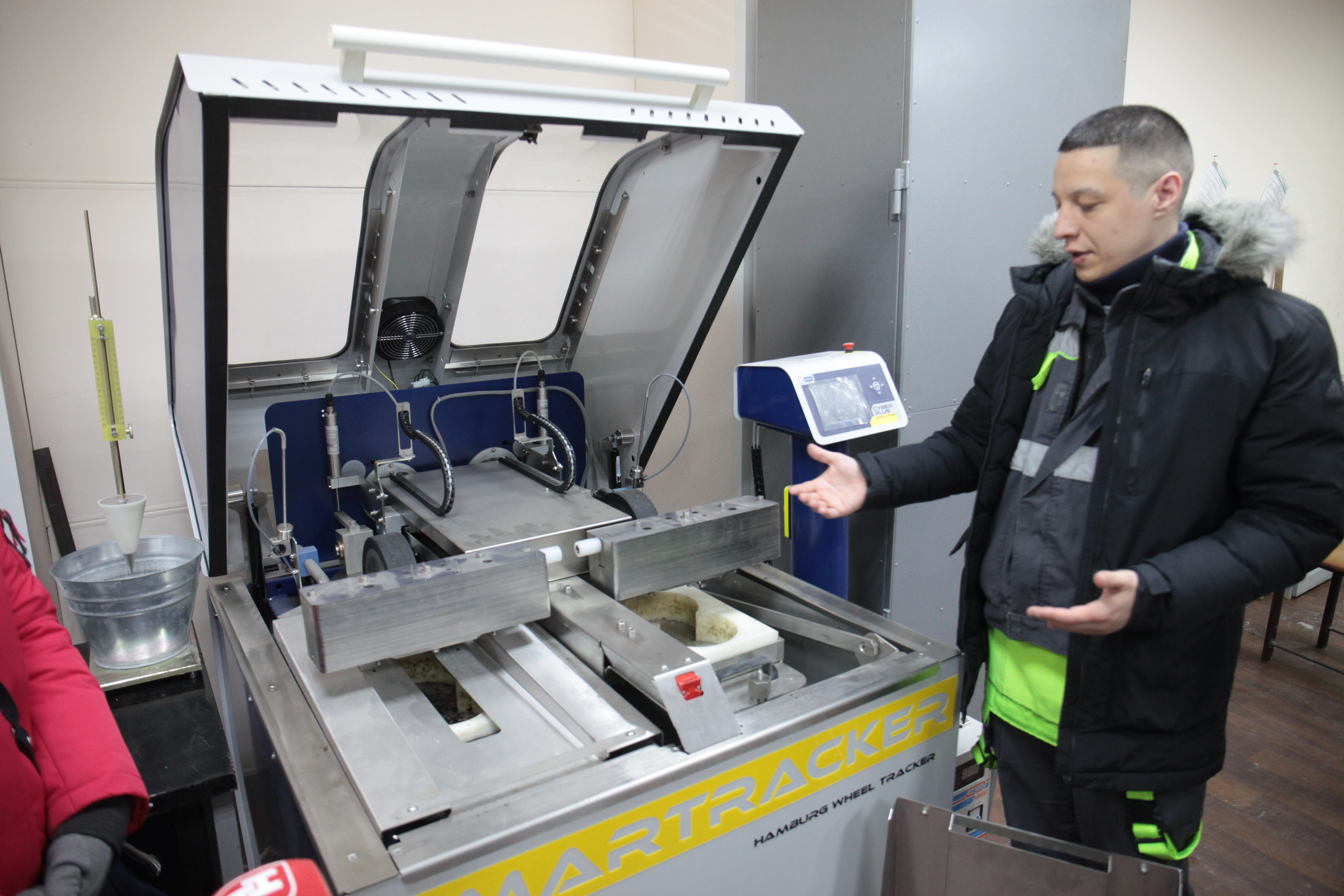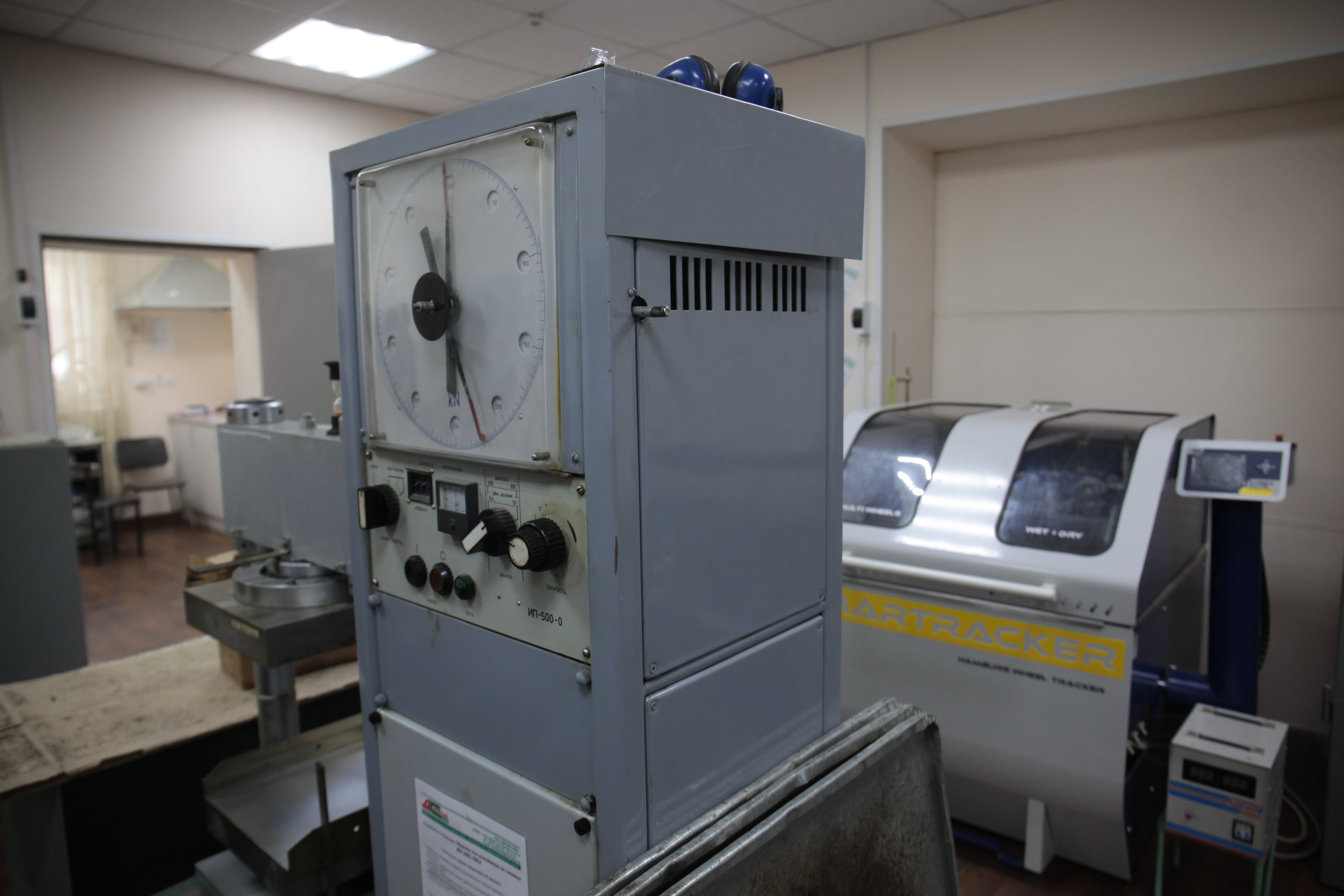В лаборатории асфальт проверяют на прочность.