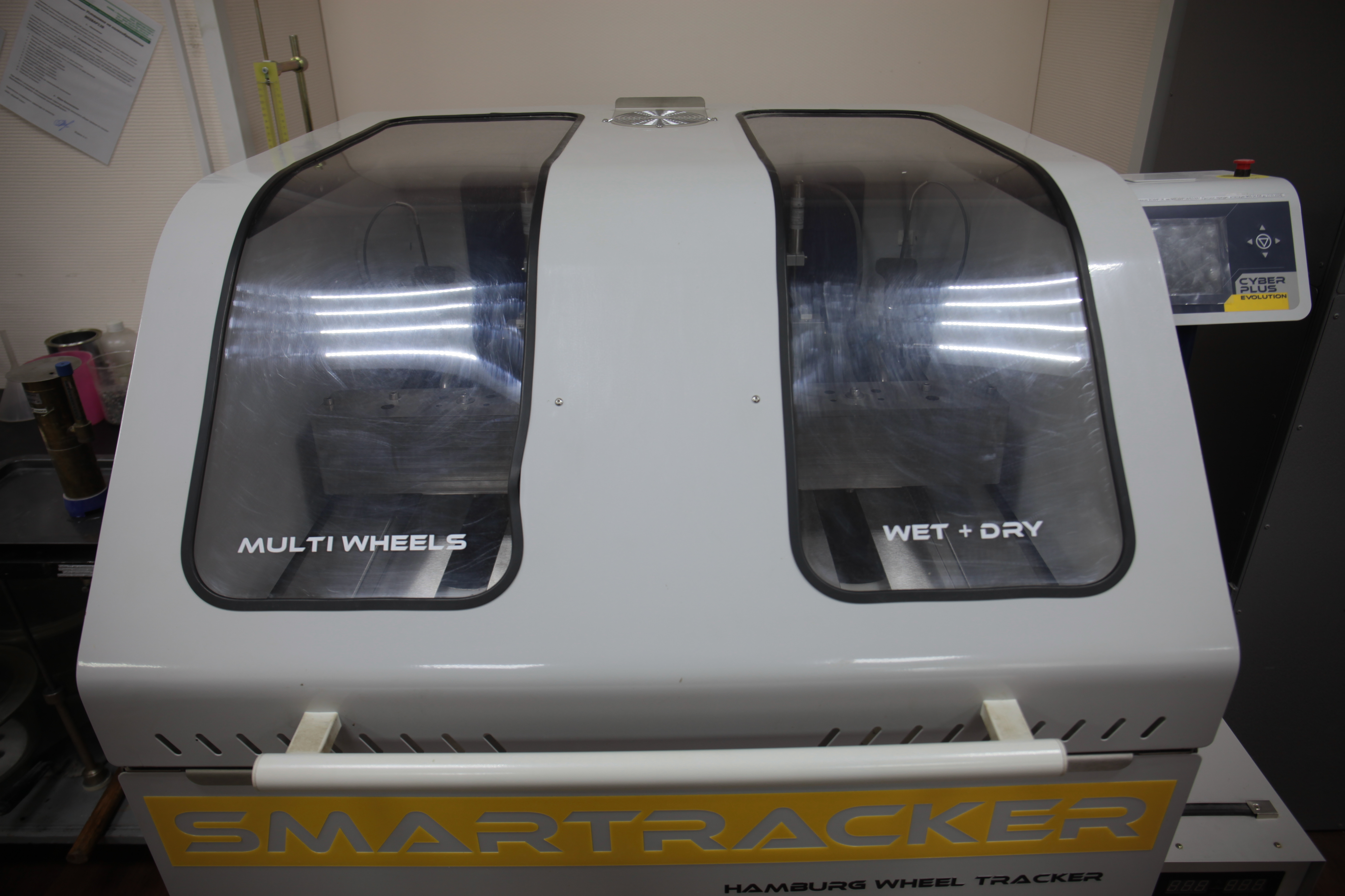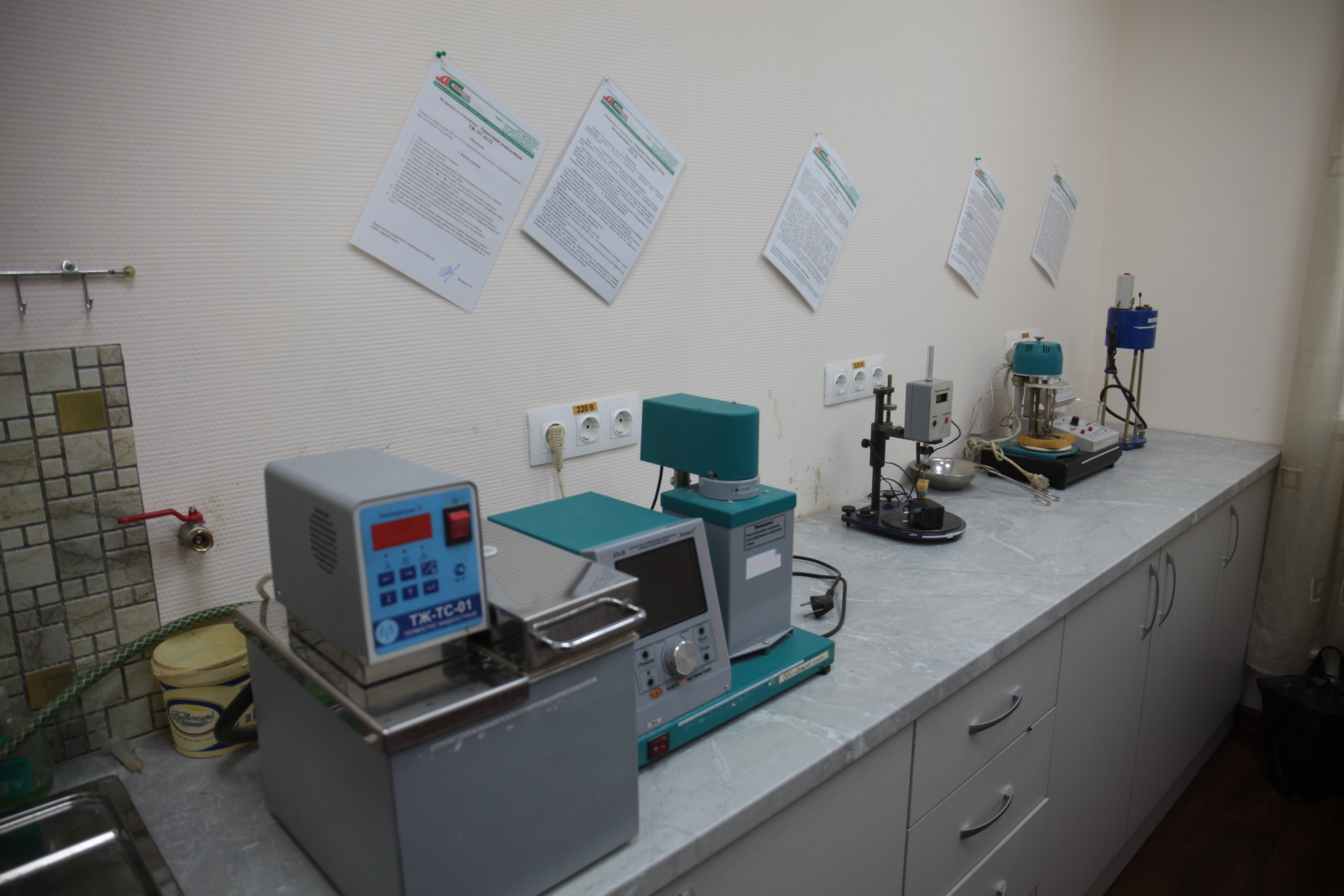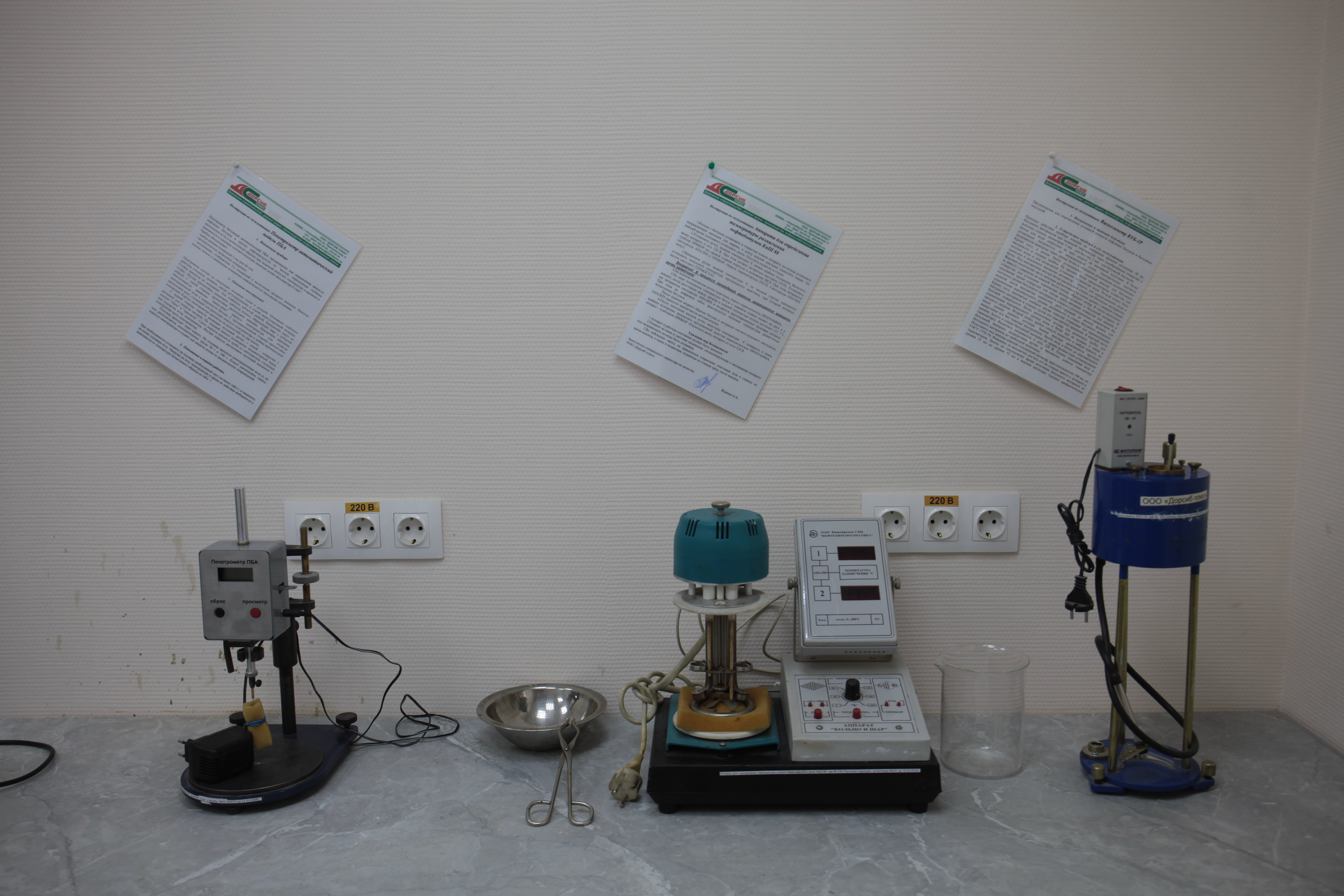 В лаборатории асфальт проверяют на прочность.