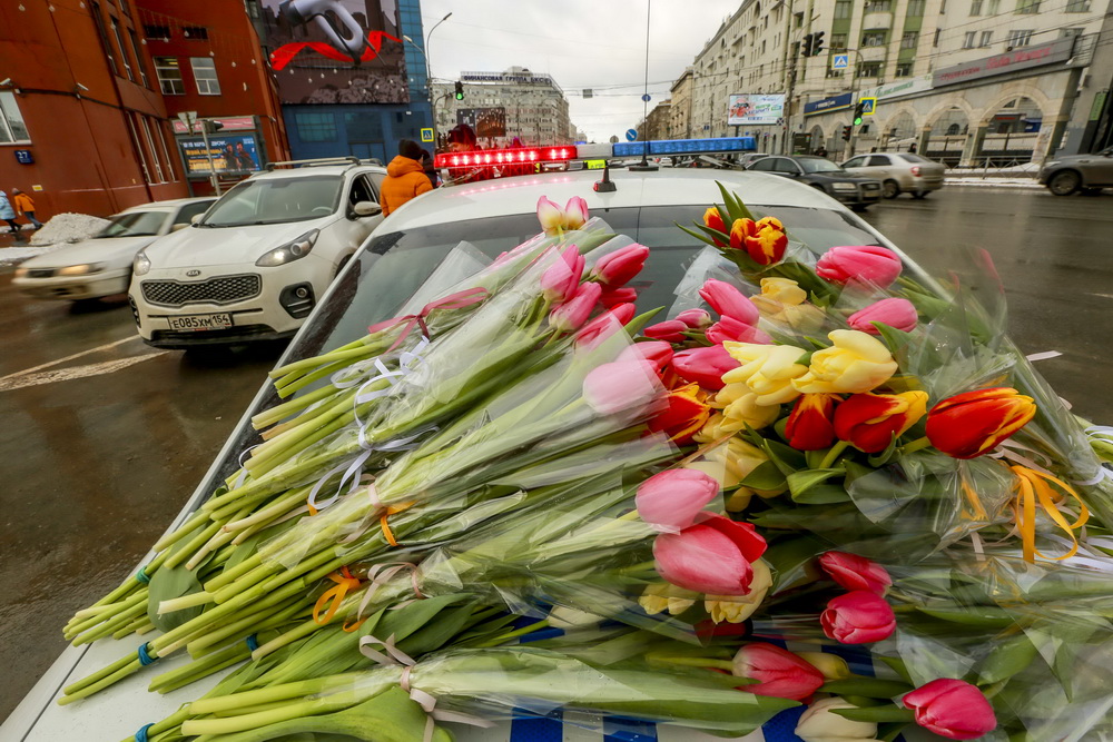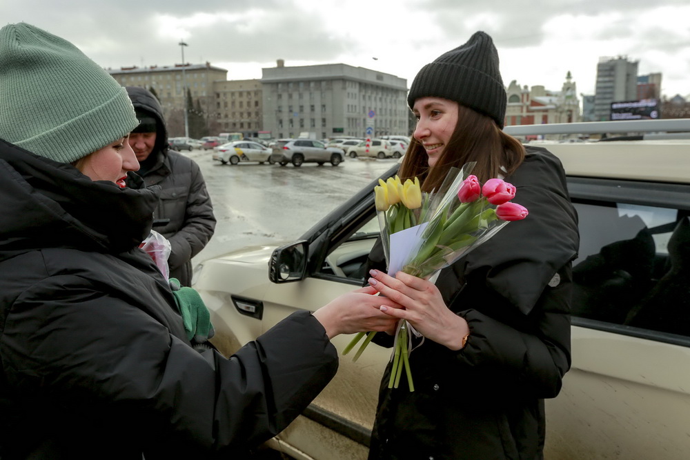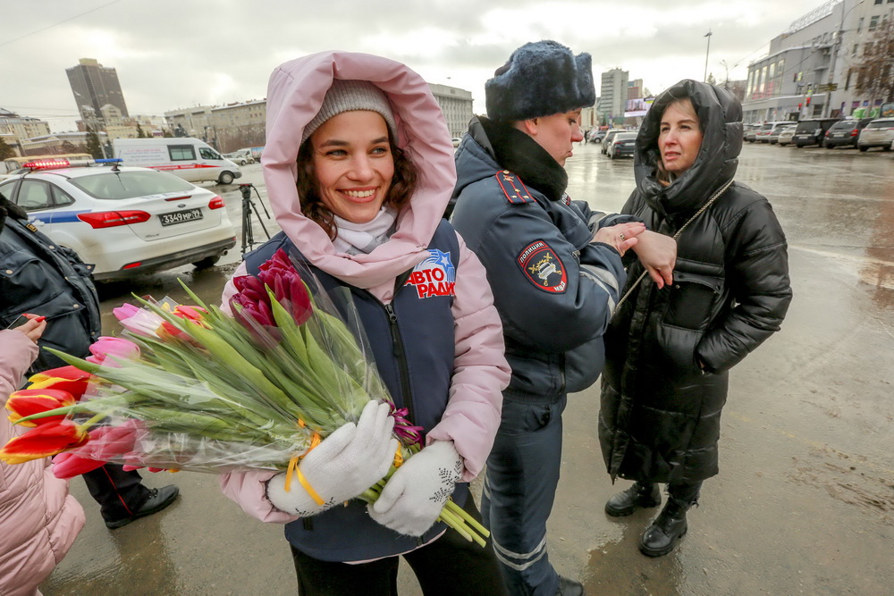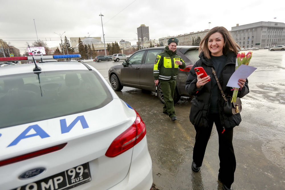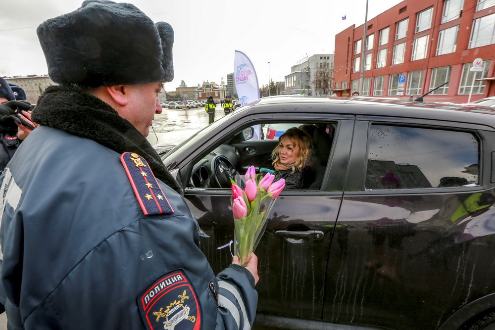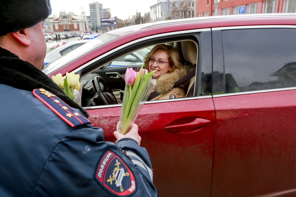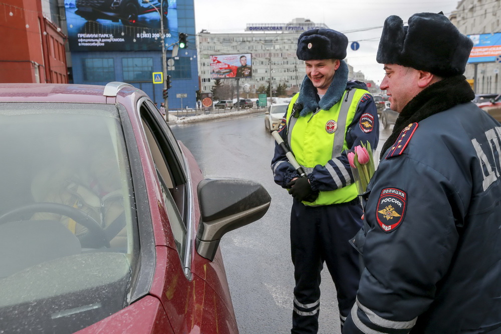 Сотрудники ГИБДД раздали тюльпаны женщинам-водителям в Новосибирске