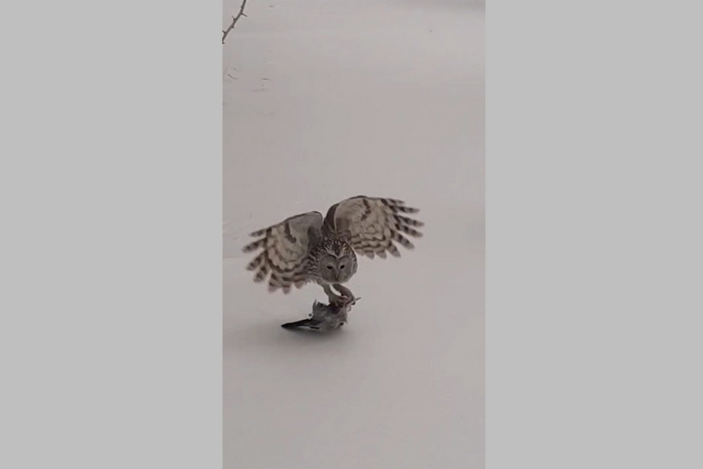 Хитрая сова-хищница охотится на голубей в Новосибирске