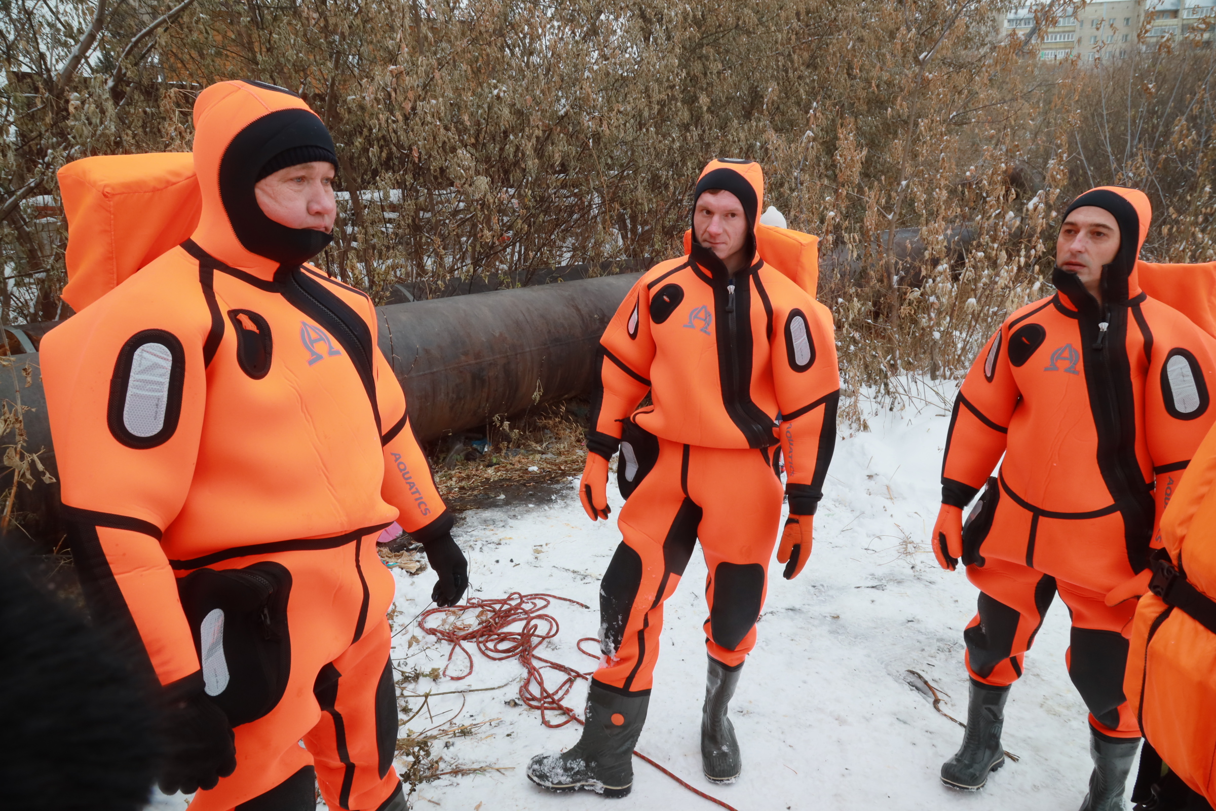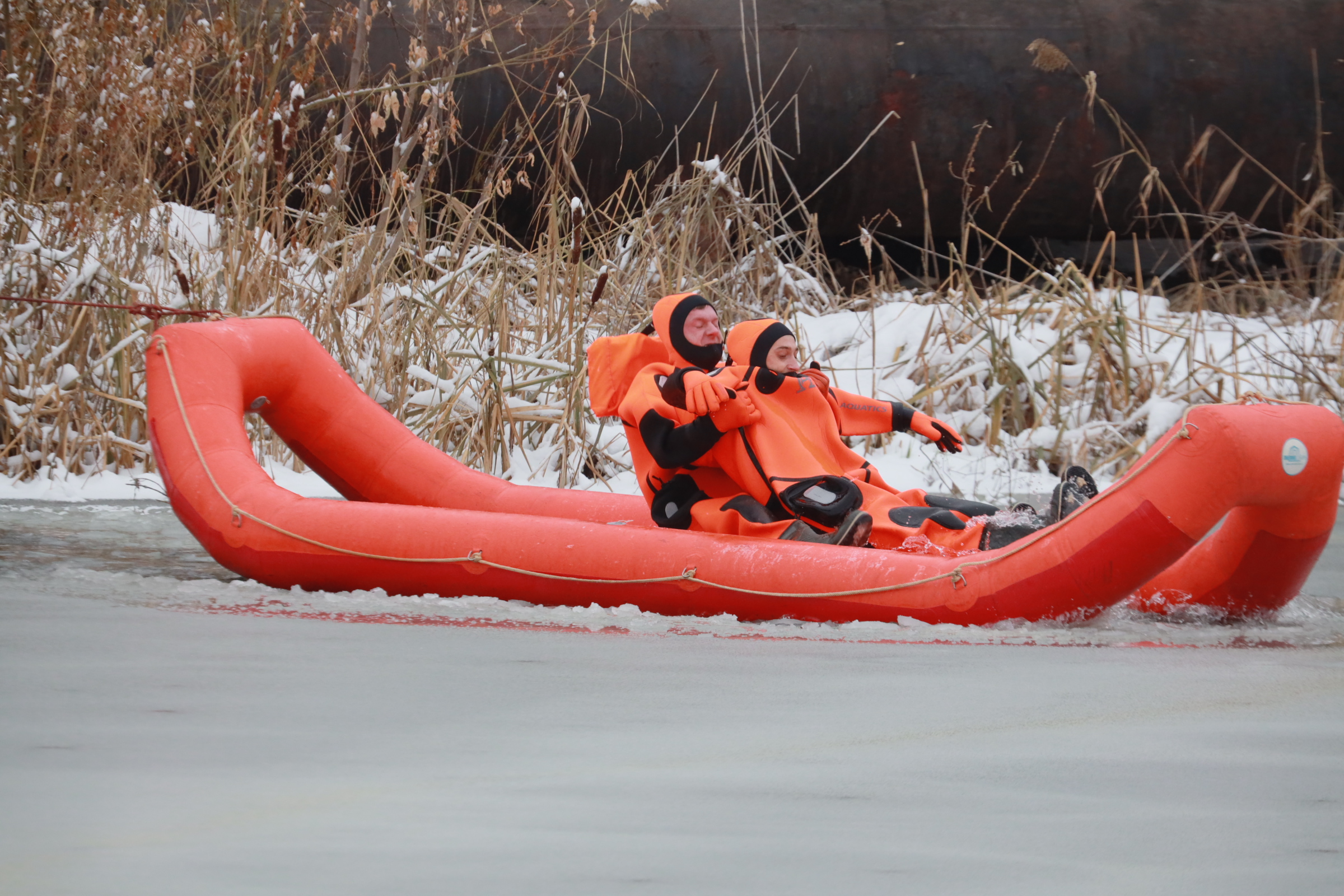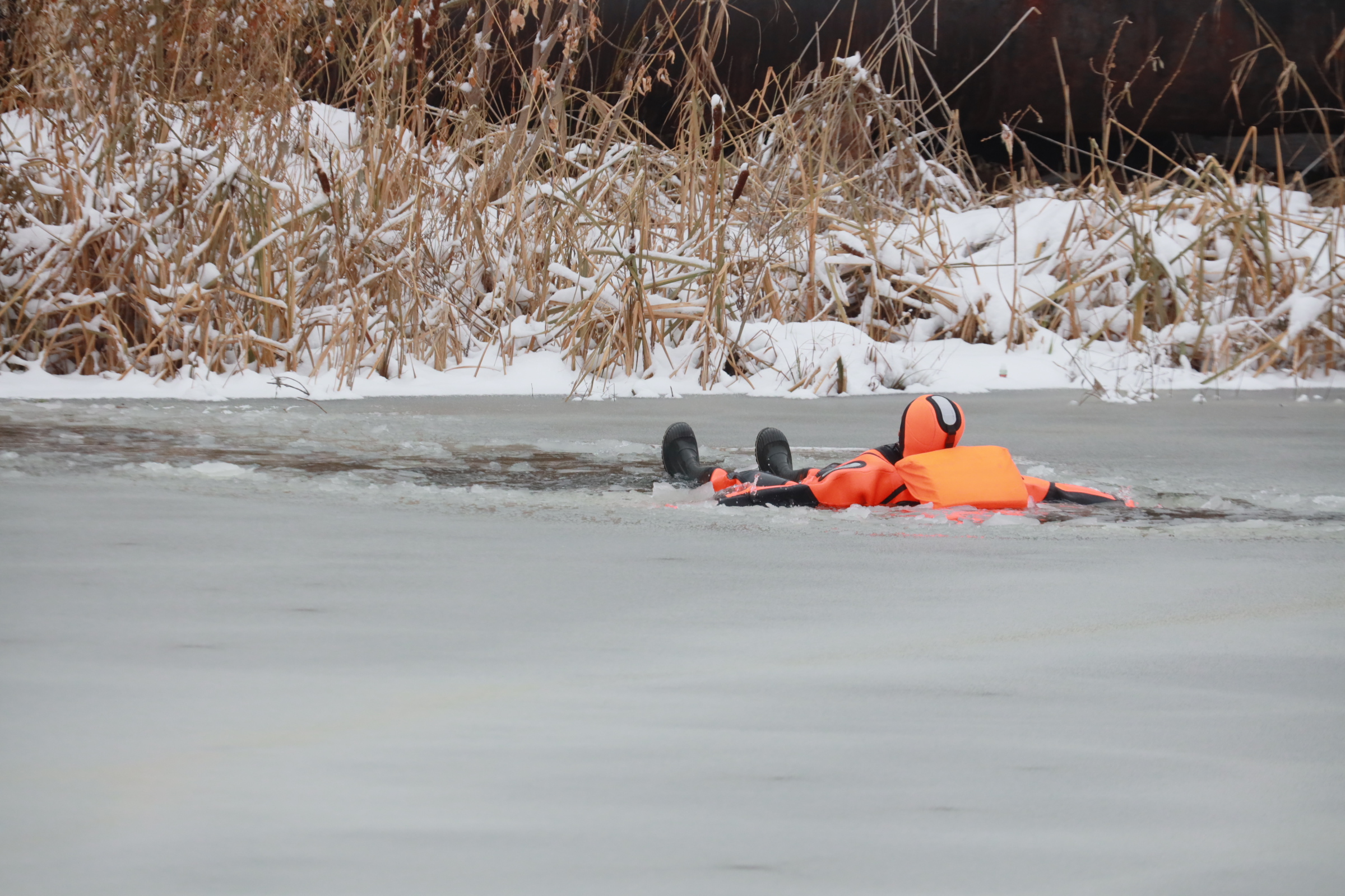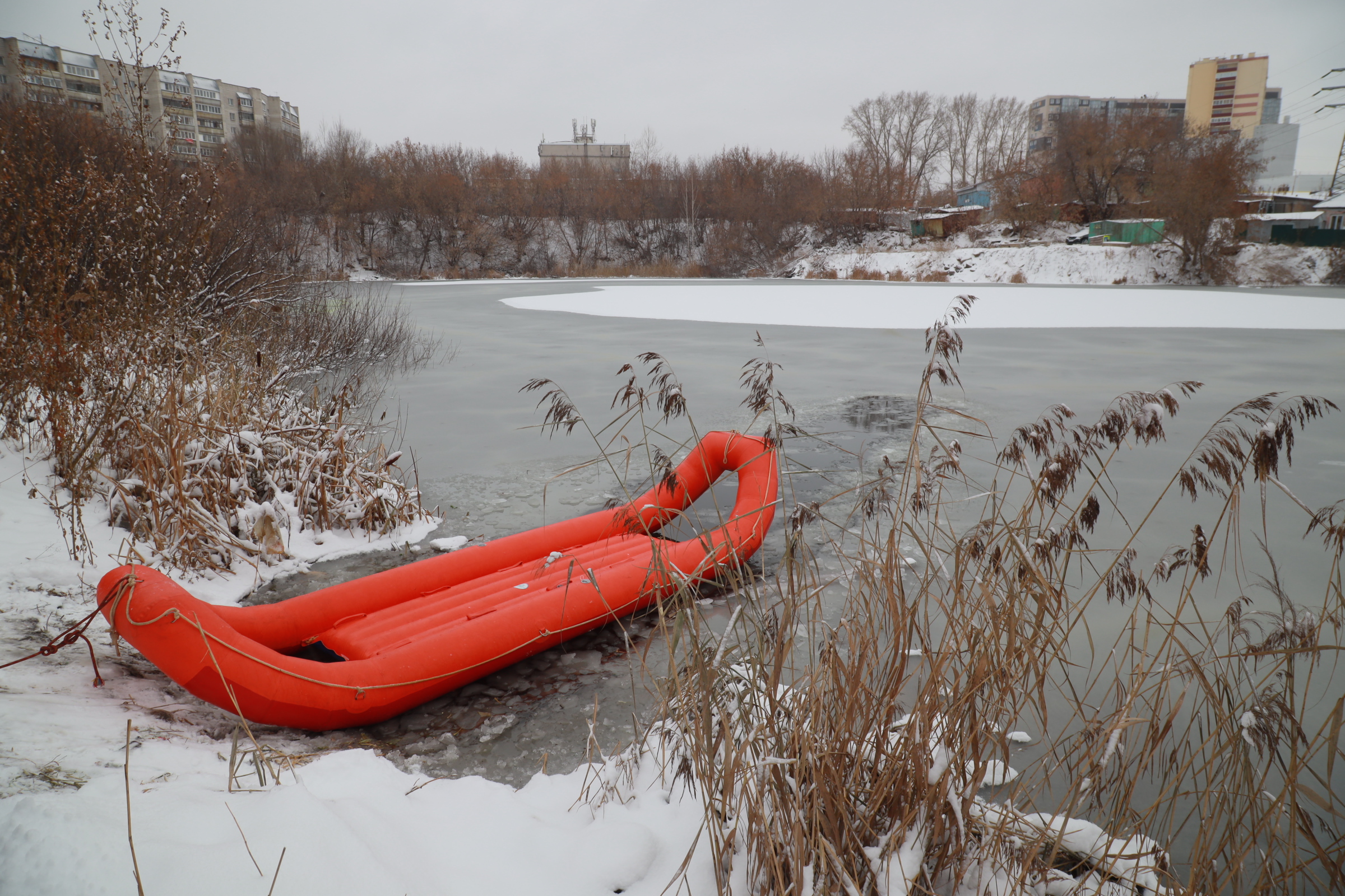 Муниципальные спасатели тренируются оказывать помощь людям, провалившимся под лёд. Условия на учениях максимально близки к реальным ситуациям. Навыки отрабатывают на одном из городских котлованов, расположенных за ДК имени Чкалова.