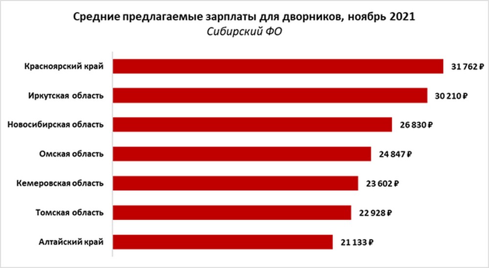 В ноябре новосибирским дворникам предлагают среднюю зарплату в 26 830 рублей, что выше показателя по Сибири в целом (25 900 рублей). Больше всего могут заработать дворники из Красноярского края (31 762 рубля в месяц), а самые маленькие доходы — у их коллег из Алтайского края (в среднем 21 133 рубля).