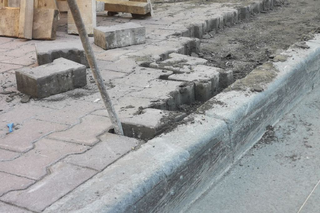 Сейчас здесь убирают старую плитку и бордюрный камень.
