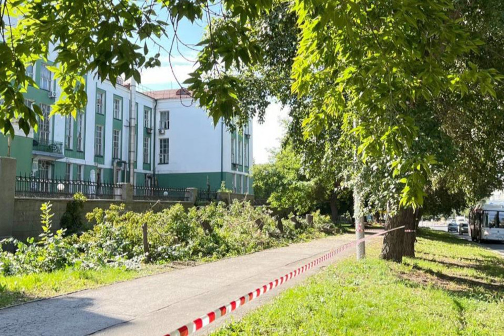 Реконструкцию газонов начали на улице Бориса Богаткова. В пятницу, 22 августа, сигнальной лентой огородили участок тротуара вдоль Новосибирского аффинажного завода. Здесь пилят старые деревья.