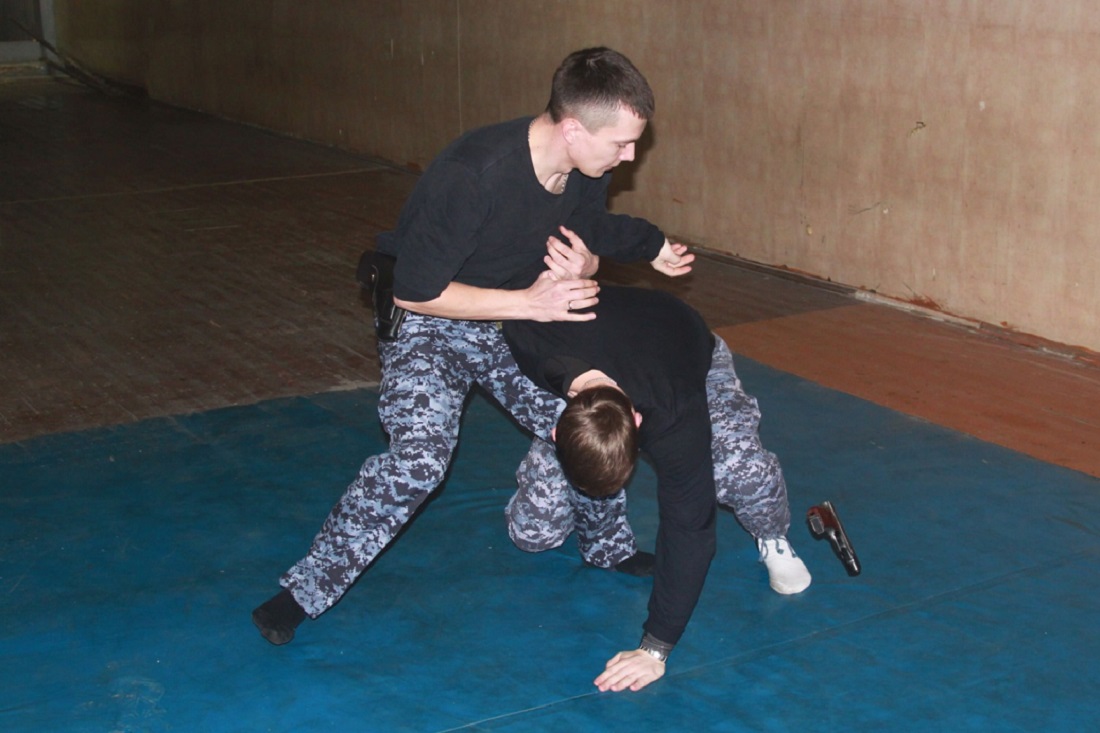 Вторая смоделированная ситуация: поступило сообщение о том, что человека ударили ножом. Перед участниками стояла задача задержать преступника, досмотреть его и изъять спрятанное под одеждой оружие — нож или пистолет, вызвать на место следственно-оперативную группу и скорую помощь.