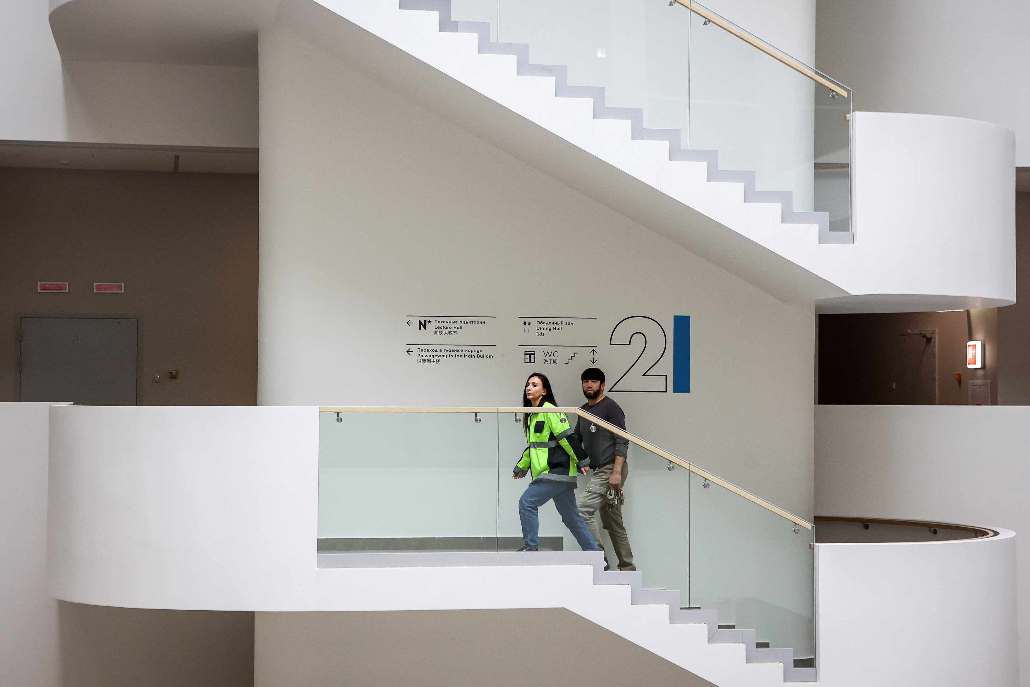 «Студенты, преподаватели, сотрудники могут спокойно преодолевать данное расстояние даже зимой, не надевая верхнюю одежду, спокойно перемещаясь по пространствам университета», — рассказала руководитель дирекции по строительству уникальных объектов компании «Единый заказчик» Наталья Зарубина.