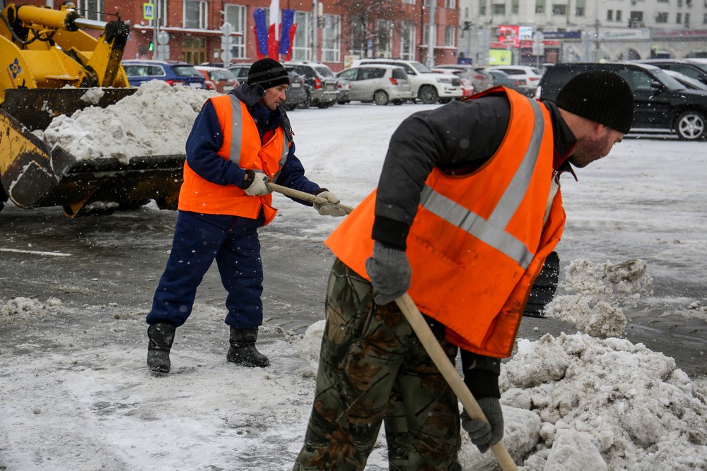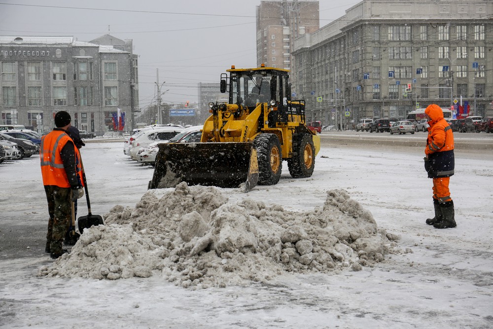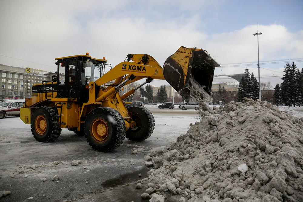 Погрузчик на площади Ленина и одинокие снегоуборщики по всему городу. На проезжей части видно, что применили реагенты: тает даже в минусовую температуру. На тротуарах работают «Чистики».