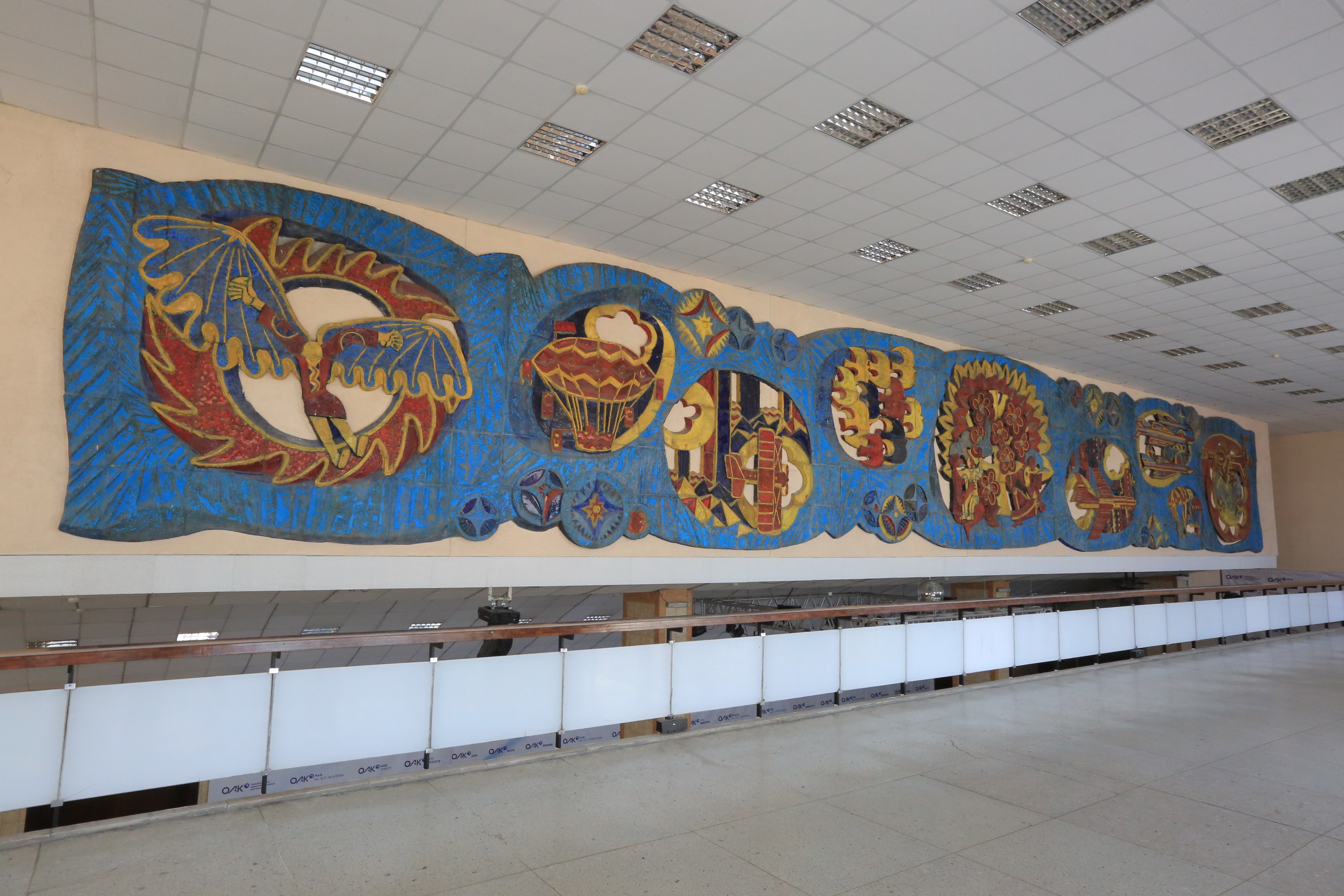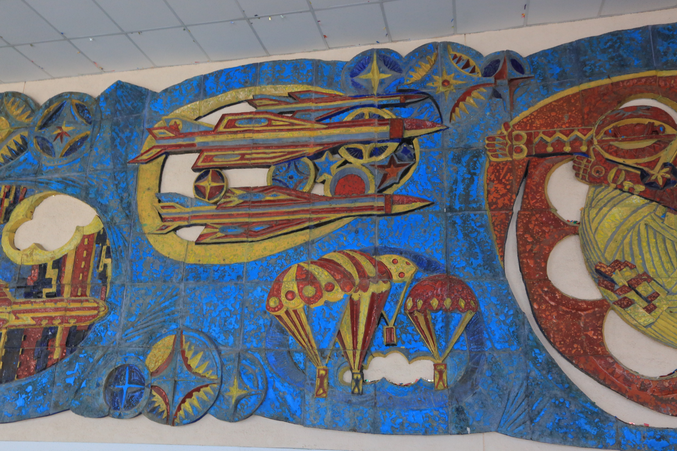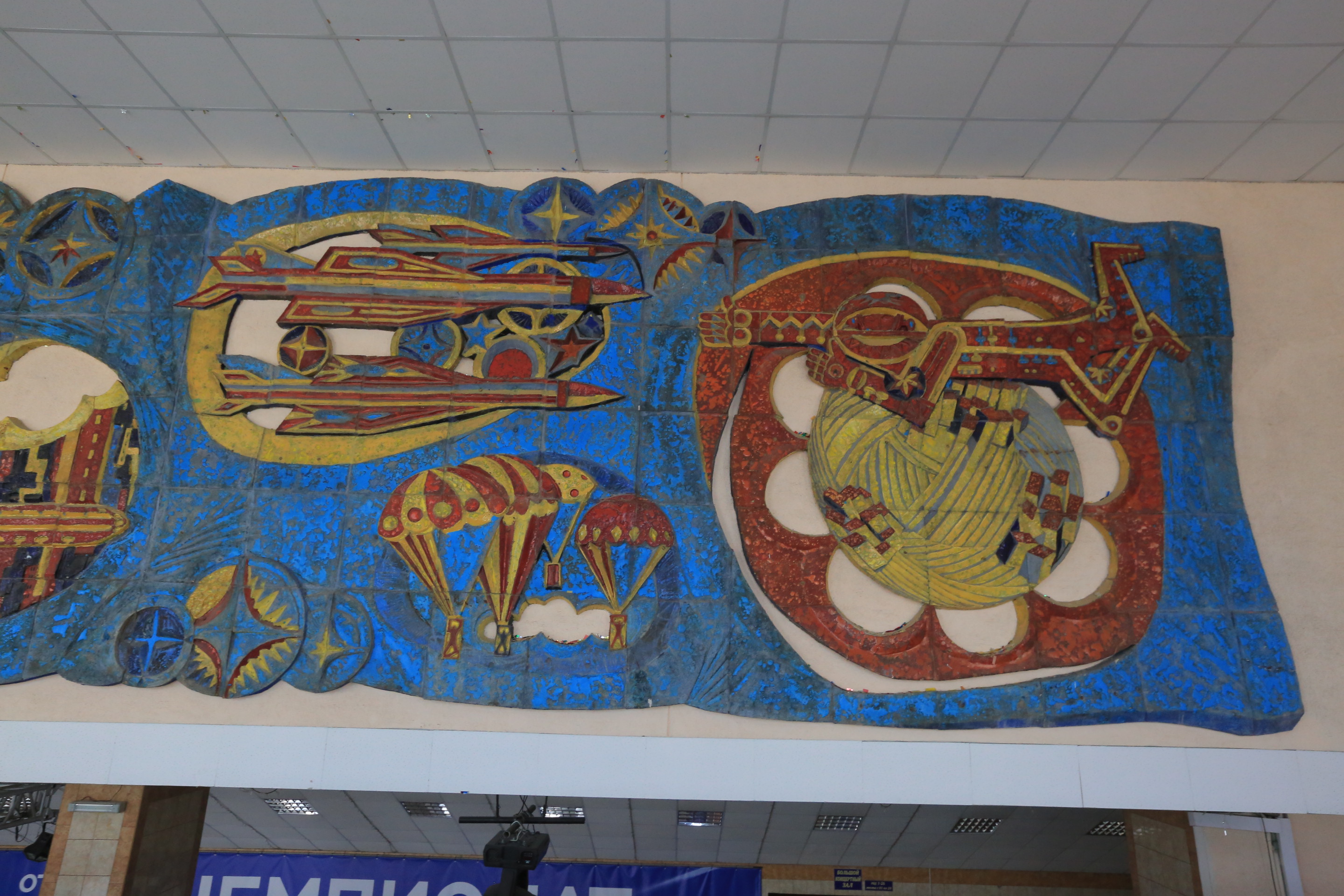Пожалуй, основным декоративным элементом интерьеров дворца культуры служит барельефное панно «История развития воздухоплавания и космонавтики», расположенное на глухой стене фойе на втором этаже. Эту картину создали скульптор-керамист Валерия Семёнова и художник-монументалист Герман Черёмушкин. Работа поражает своими размерами — в длину она больше десяти метров.