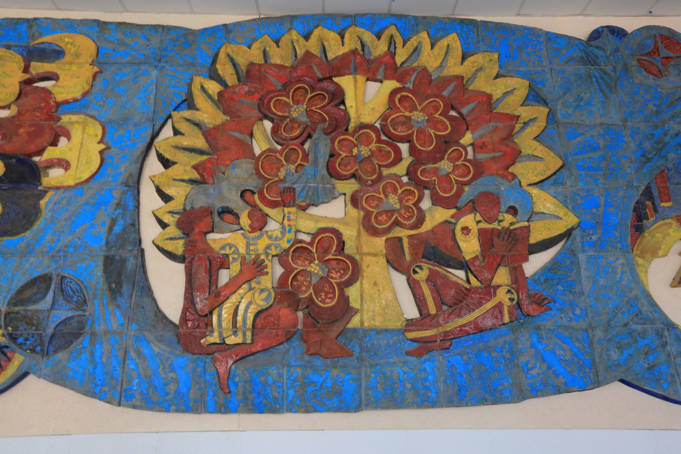 Барельеф хорошо видно в вечернем освещении с проспекта Дзержинского сквозь огромные витражи парадного фасада. Директор ДК Евгений Бобров сообщил, что в этом году панно планируют отреставрировать, освежив на нём цвета.