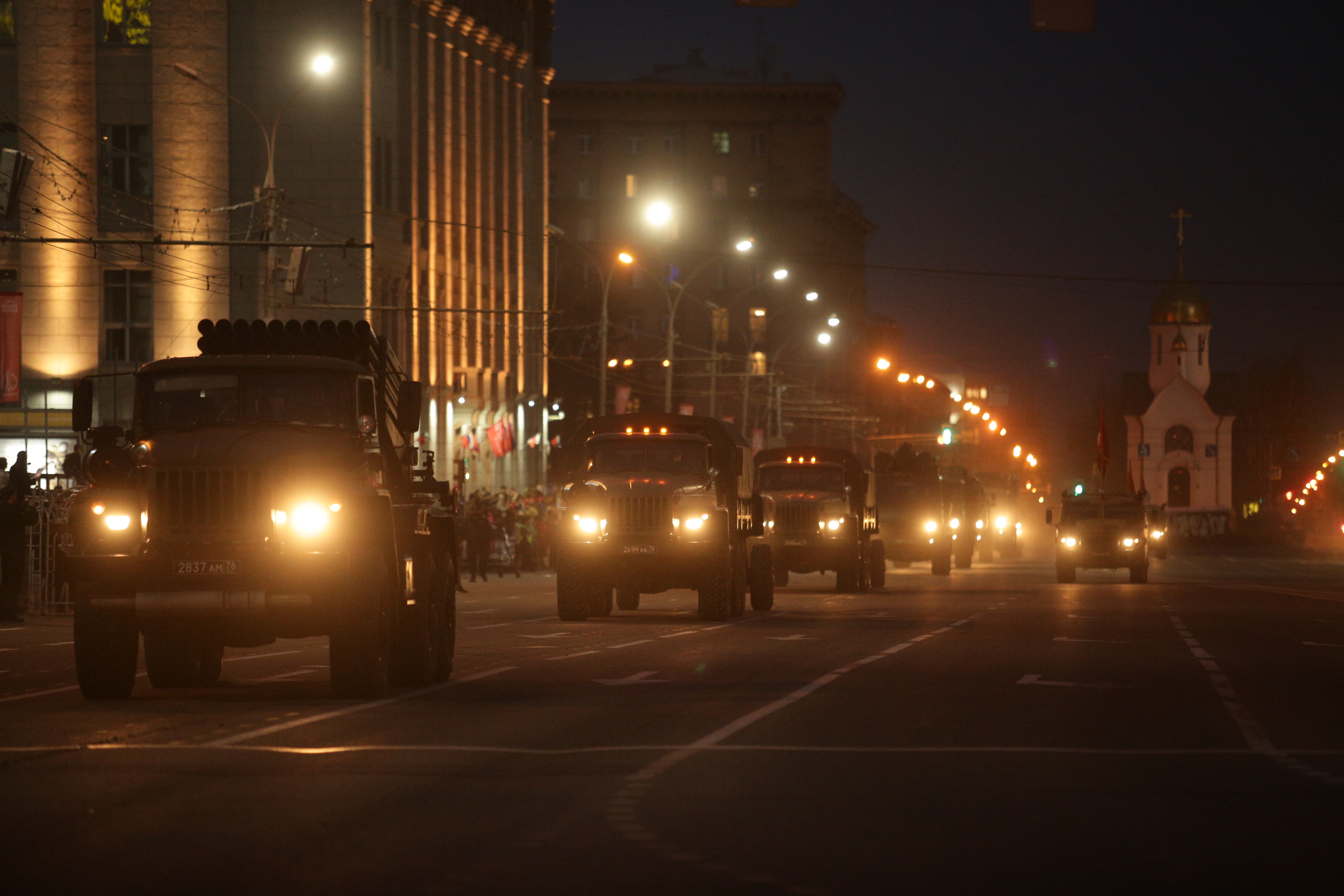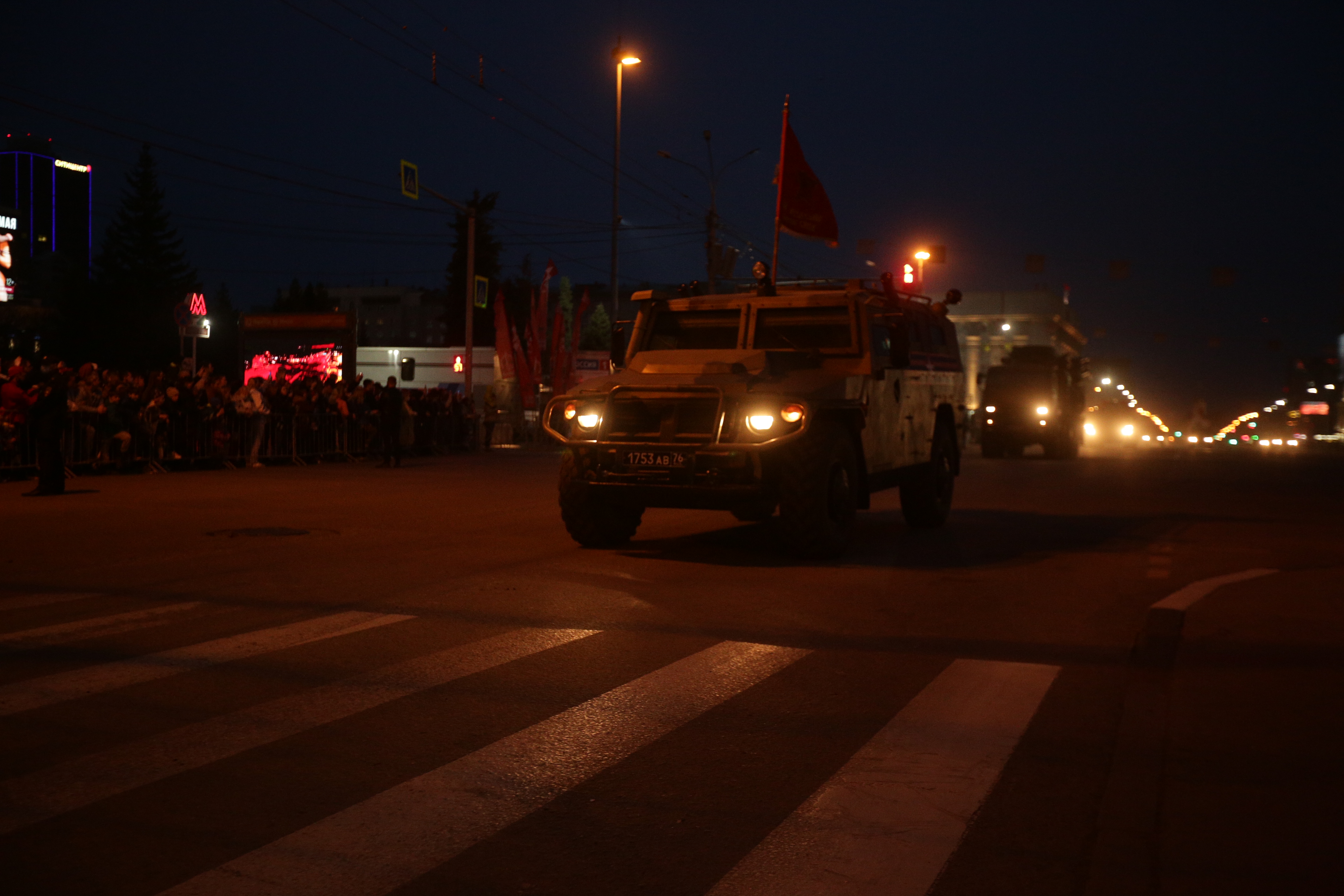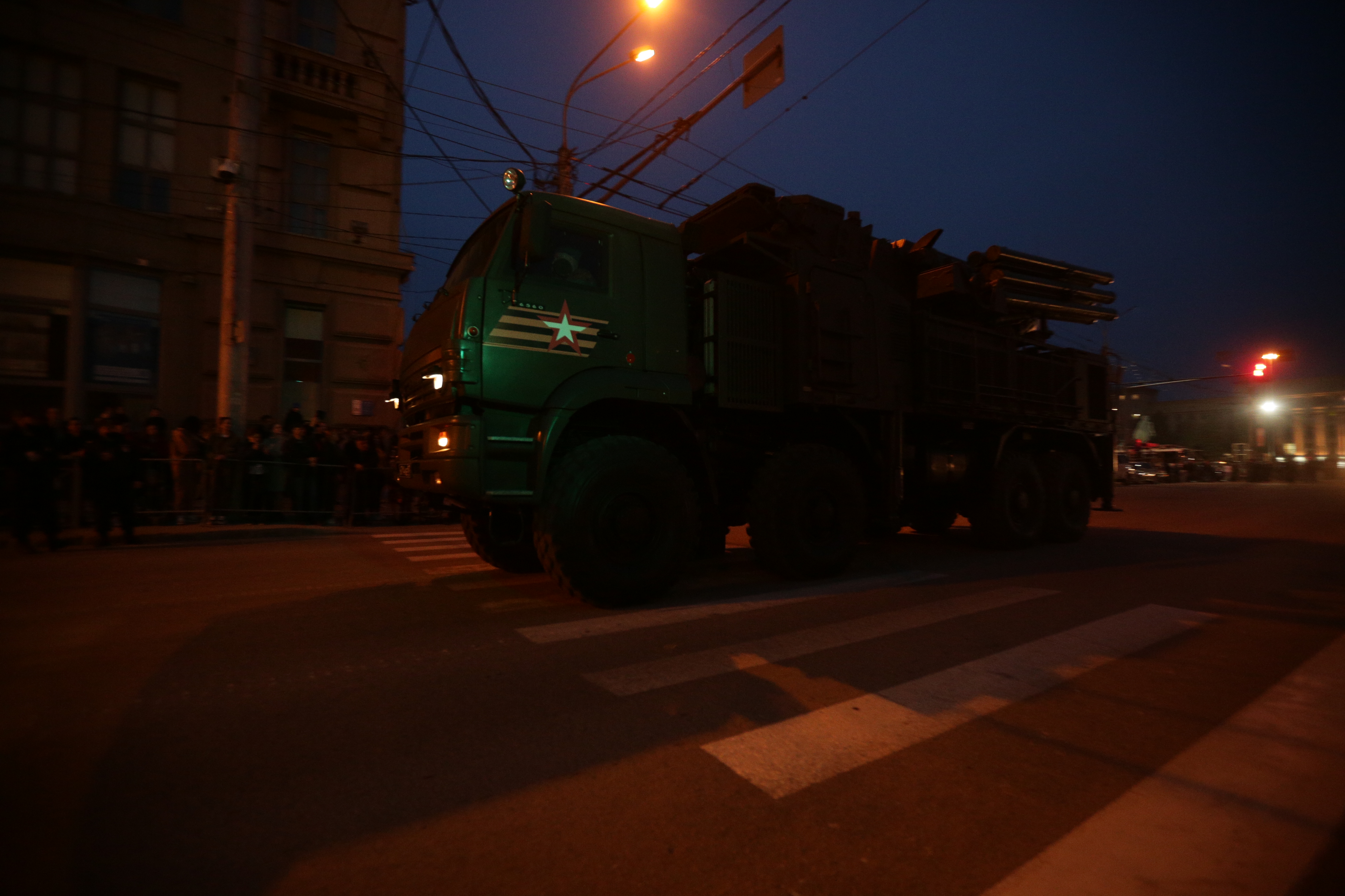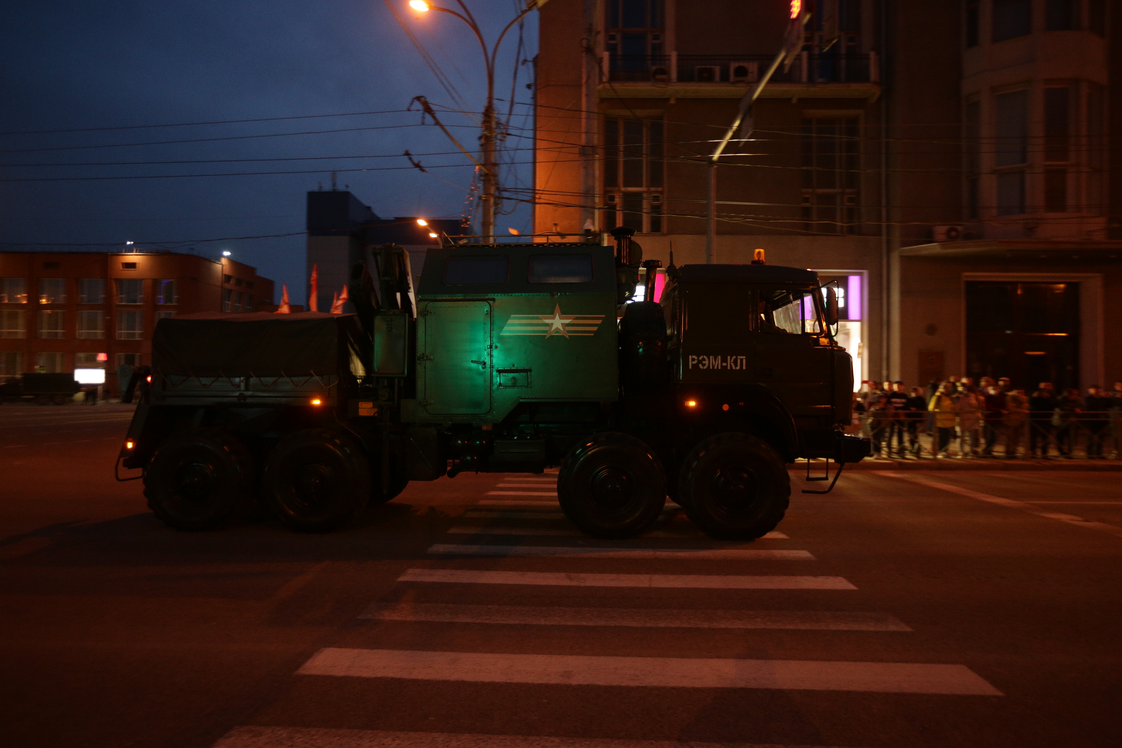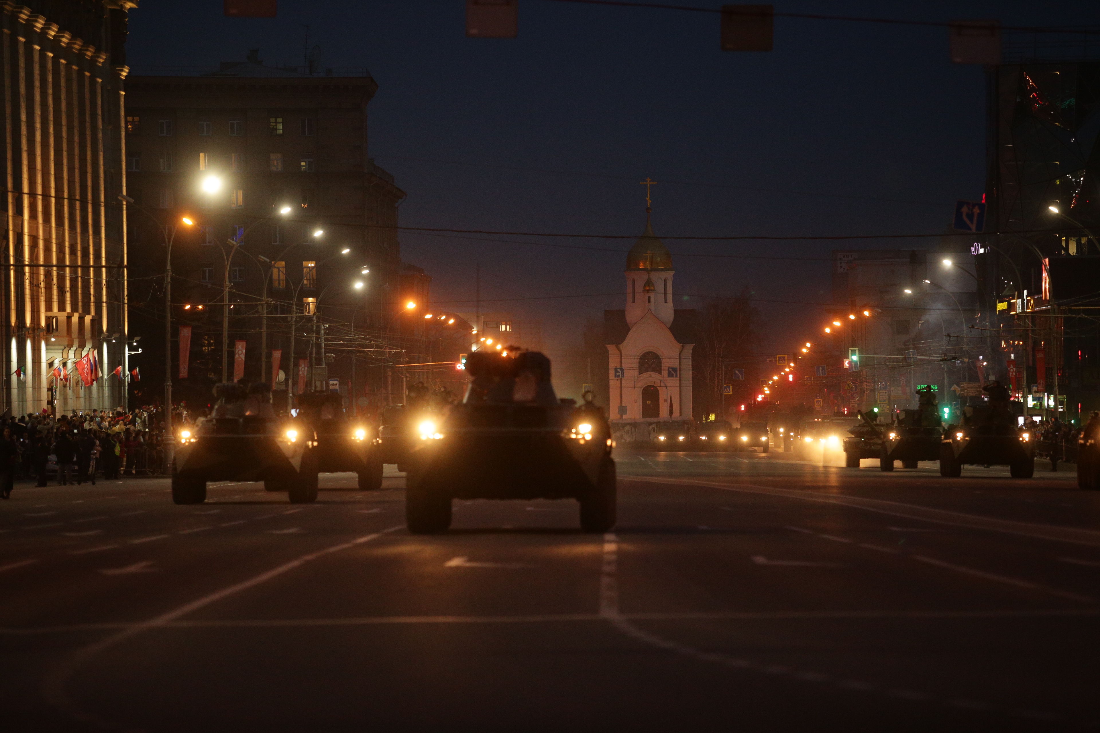 Репетиция парада началась в 17:30 и продолжалась до самой темноты. По главной площади города промаршировали сотни людей в военной форме и проехали колонны бронированной техники: ракетные комплексы «Ярс», «Триумф», «Искандер» и другие редкие гости центральных улиц.